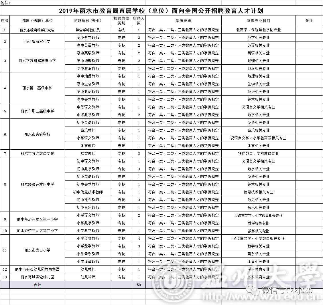 本次丽水市教育局直属13个单位公开招聘教育人才共50名,具体岗位(专业)、人数和报考资格条件详见附件1:《2019年丽水市教育局直属学校(单位)面向全国公开招聘教育人才计划》。