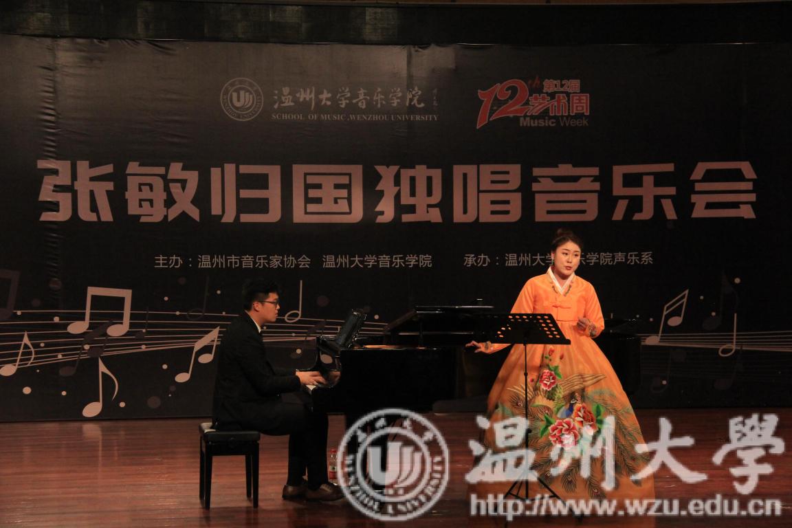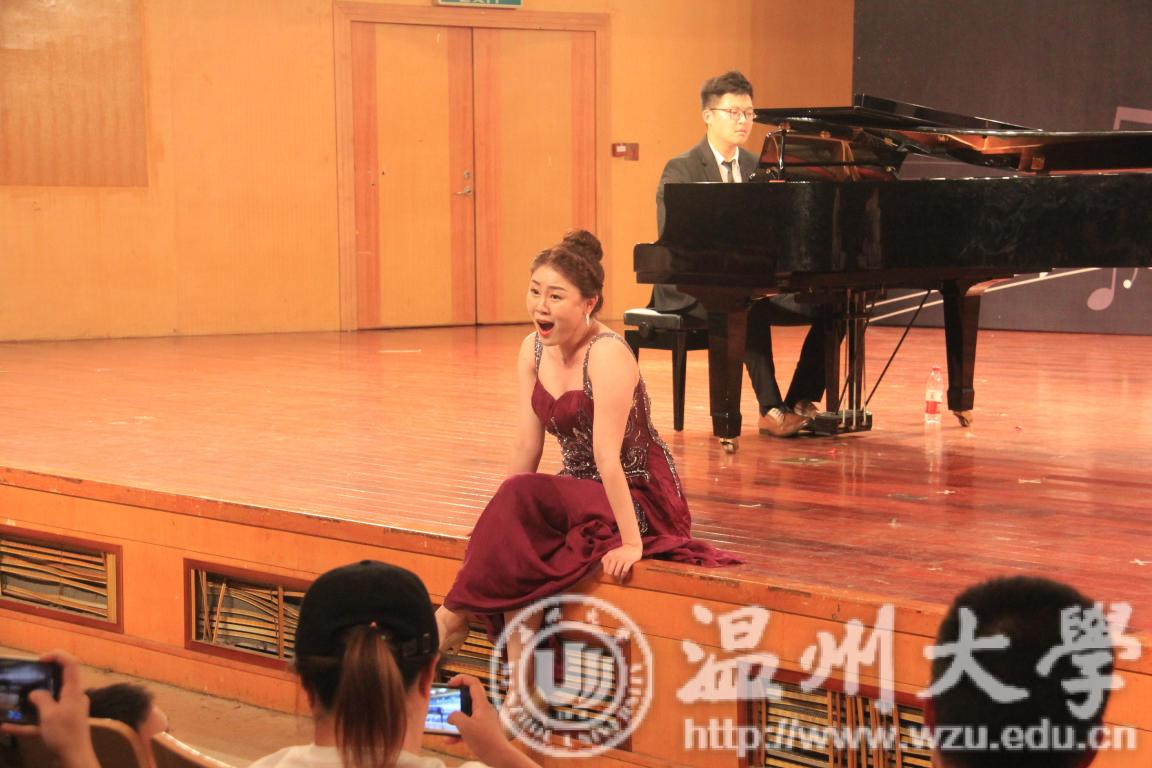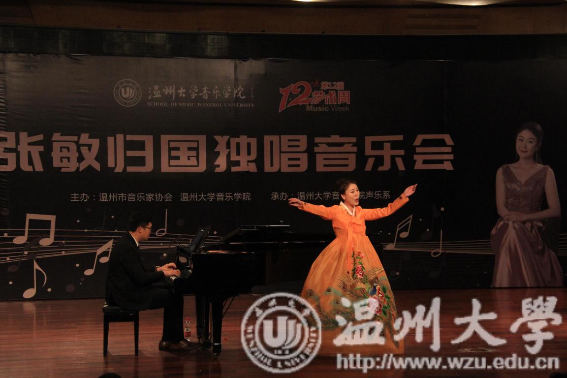 短暂的中场休息过后,张敏老师身着朝鲜族服饰重返舞台,为大家献上了朝鲜族作曲家崔三明先生的作品:《祖国怀抱多温暖》、《摘苹果梨的姑娘》,张敏老师采取了中韩文混合的形式来诠释两首作品,不仅让我们欣赏了朝鲜族民歌的独特曲风,还让我们感受到了祖国每一寸土地的热情与亲切,以及各个民族对祖国大地的赞扬之情,也让我们体会到了朝鲜民歌的强大魅力。随后,便是两首著名的韩国民谣《鸟打令》、《阿里阿里郎》,这两首经典之声让我们体会到了朝鲜族民族的别样风情和扣人心弦的音乐风格。张敏老师通过亲切甜美的歌声传递出了浓郁、独特的朝鲜民族特色。曲毕后特邀嘉宾于仁道老师为大家演奏了李斯特的经典曲目《Les jeux d'eau à la Villa d'Este》,一个个音符在于老师的手中跳跃,将在场每位观众都带入李斯特的音乐世界中。最后张敏老师带来了古诺的《Je vuex vivre》(From opera “Romeo et Juliette”)与威尔第的《Caro nome》 (From opera “Rigoletto”), 这两首歌也是本场的高潮,短促重复的高音、跨度极大的琶音、难度极高的弱音,每一个音都非常精准的控制。在最后一首歌,张敏老师非常调皮的踱着小步,坐到了台阶上和观众们亲切的互动。甚至在最后,张敏老师还躺了下来,即便如此,张敏老师的气息依旧非常稳定。