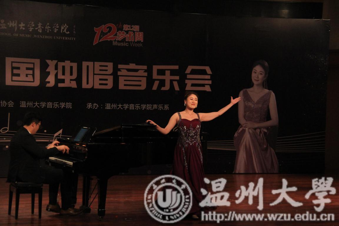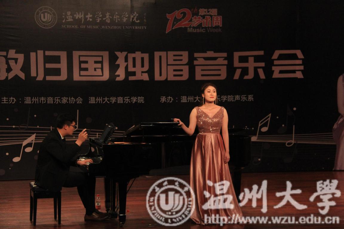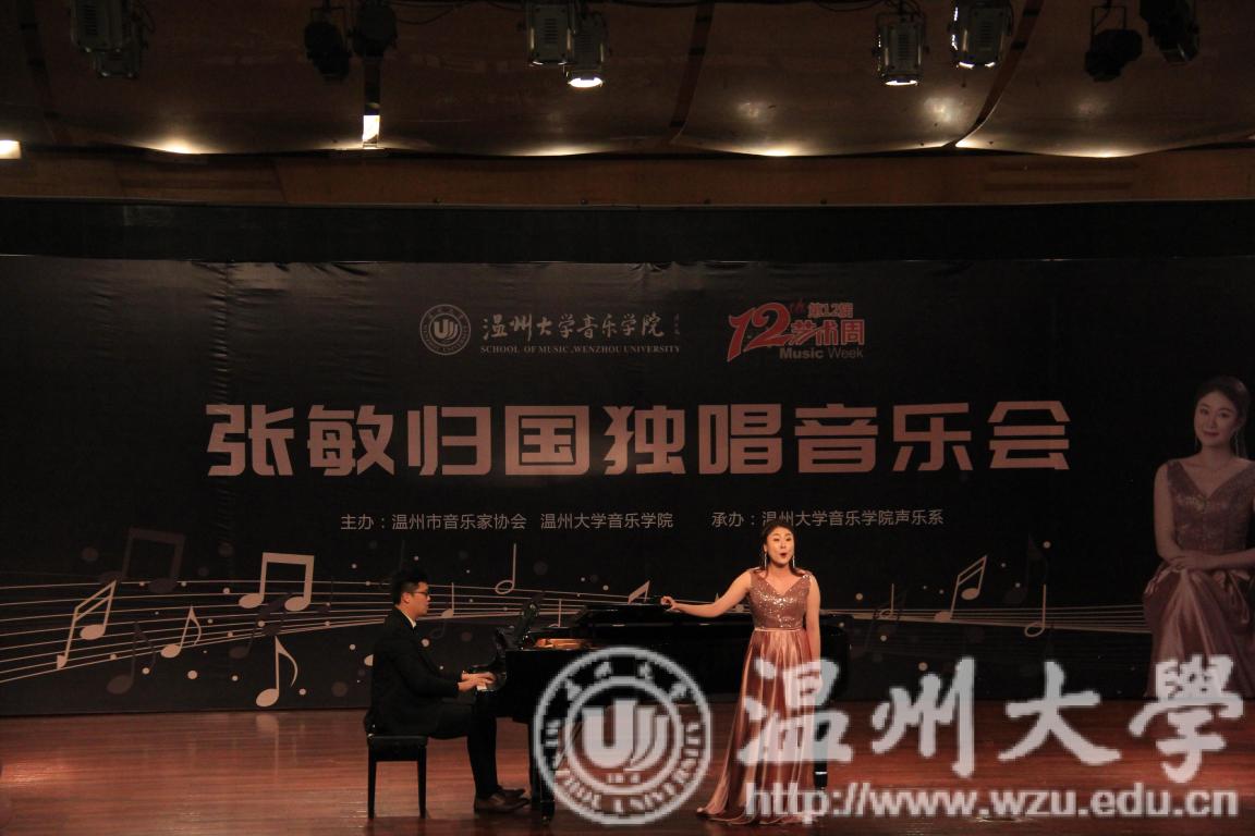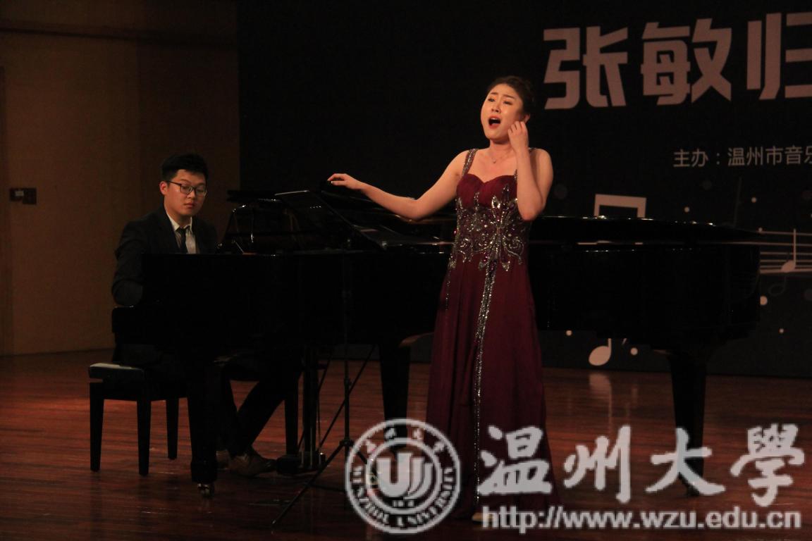晚会伊始,张敏老师以一袭优雅大方的长裙出场,宛如从画里走出一般,引起满堂欢呼喝彩。首先,张敏老师为大家演绎了巴洛克声乐作品中难度较高的维瓦尔第的三首曲子:选自歌剧《彭托王后阿尔西坦》中的《Col piacer della mia fede》和《Ben conosco a poco a poco》;选自《格里塞达》中的《Agitata da due venti》;德国艺术歌曲舒曼、沃尔夫的同名作品《Er,ist's》、克拉拉舒曼的《Er,ist gekommen》。稳定的颤音和花腔技巧无不展现出张敏老师演唱时的轻松自如,绚丽的声乐技巧引起了观众的阵阵赞叹。