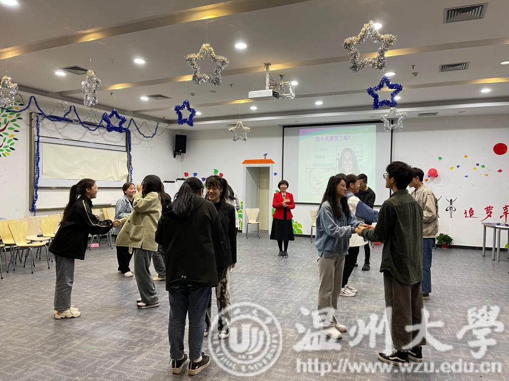讲座以游戏互动的方式拉开帷幕。张老师与同学们手拉手进行“传递幸福”游戏,让在场的同学相互认识、拉近距离。接着,张老师组织大家建立一个“同心圆”并响亮地喊出口号,这让同学们初步感受到了积极心理学的力量。她指出“幸福人生的三大指针”,指针之一,即有人爱、有事做、有希望。老师还说到:“这个世界上最爱你的人就是你自己。”漫漫人生路,陪伴自己最多的人就是你自己,每个人都要学会接纳自己,需要超越的只有自己,不与别人攀比。随后,大家进行了“心有千千结”的游戏。同学们手拉手围成一个圈,接着随意走动交换位置,老师喊停后,同学们就近与原来相邻的同学牵手,并想办法变回原来的圆圈。虽然游戏具有一定难度,但同学们齐心协力找到了成功的秘诀。张老师告诉我们这个游戏旨在让大家明白要用积极的思维对待每一件事情,不论学习、生活、情感还是人际关系中遇到的其他事情,不能逃避,应该积极主动思考如何解决事情。幸福的最大源泉体现在与他人的良好关系中。