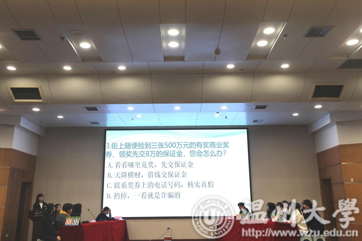 接下来进入到活动的第二部分,由茶山派出所周文涛警官为我们讲解反诈防诈安全教育宣讲。周警官为大家分享了多起发生在我们身边的真实案例,并罗列了温州几所高校受到诈骗的数据,在场同学认真观看。周警官指出,高校的受诈骗占比非常之大,这不得不让我们在耳边敲响警钟。另外,周警官还介绍了几个常见的诈骗方式,其中包括电话诈骗、校园贷、假冒公检法诈骗、考试诈骗、裸聊诈骗等,希望同学们可以擦亮眼睛,谨防陷入骗子的圈套。活动最后,周警官强调“套路千万条,防诈是一条,天上不会掉馅饼,守牢钱财最要紧”,望大家引以为戒。