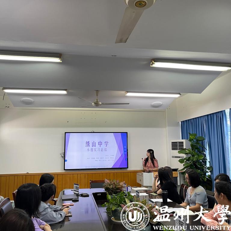 城附属学校实习小组组长,袁晓庆同学作为南浦实验中学实习小组组长,结合了音频、视频和PPT等,分别从实习学校的简介、教师团队、教学活动、班主任日常、个人感悟、工作内容、音乐课堂、实习收获等方面进行了精彩发言,他们不仅为大家展现了此次实习的成果,也是一次深刻全面的实习总结。