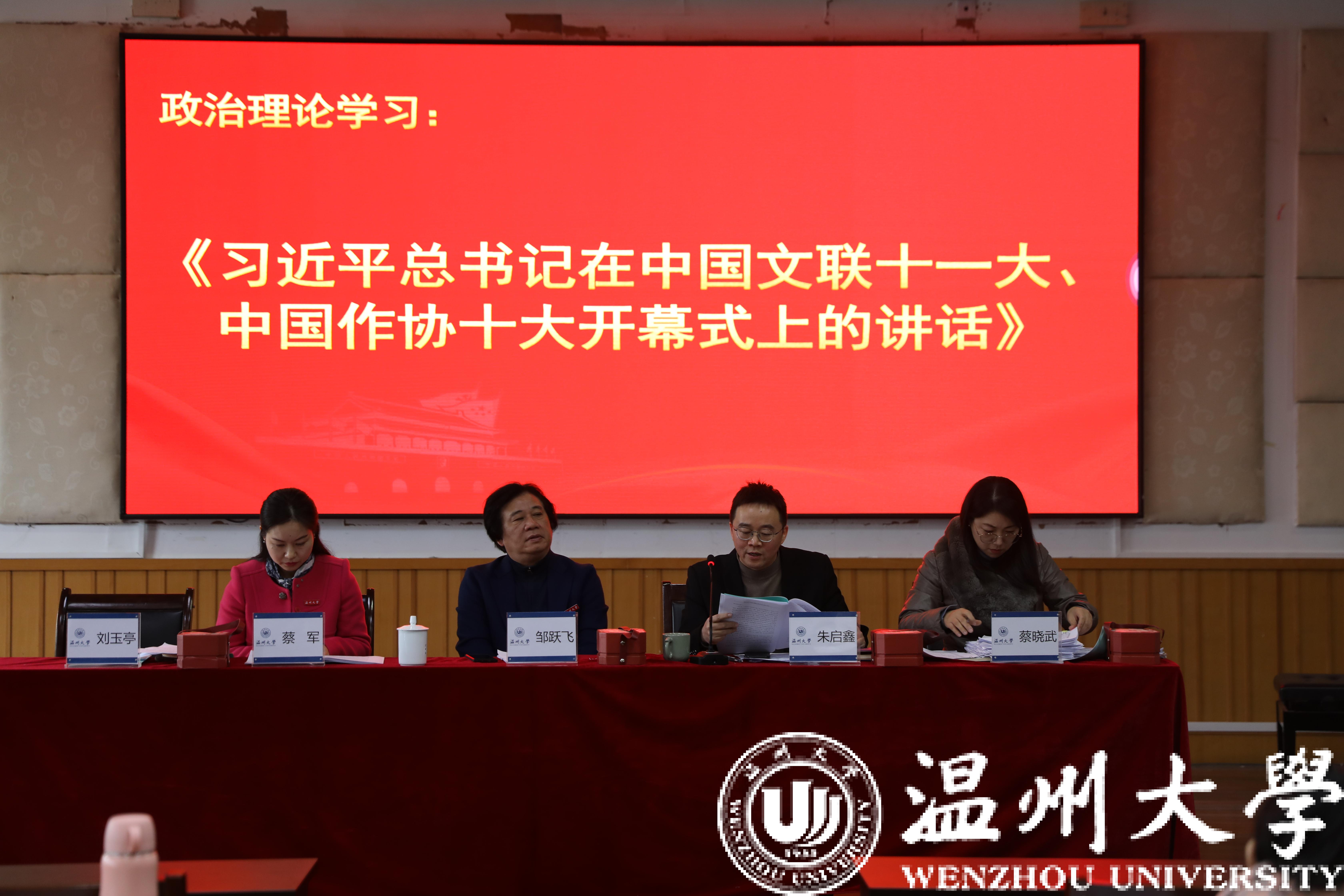 全体教职工政治理论学习会的召开,有利于切实推动政治理论学习入脑入心,提高政治站位,成为推进学院各项事业发展的强大思想武器。朱启鑫书记希望全体教职工能够充分认识习近平总书记在中国文联十一大、中国作协十大开幕式上讲话精神的重大意义,全面把握、深刻理解讲话的内涵要义,紧密结合工作实际将讲话精神落实到每一项工作中,切实提高全体教职工的政治素质和理论水平。