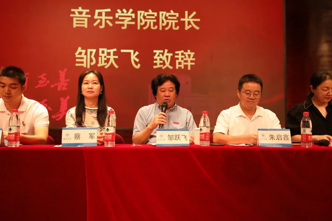 院长邹跃飞发表致辞。他对新生提出了四点要求:第一,坚定爱国信仰,牢记习近平总书记在五四运动一百周年大会上发表的重要讲话,要以爱国之情报强国之志,把个人理想融入国家理想的事业当中,并牢记习近平总书记的深情厚望,找到当代青年砥砺奋进的时代坐标;第二,夯实专业基础,邹院长希望新生们能够充分利用起学院的优秀师资和设备资源来完善提升自我;第三,注重艺术实践,我们身处于多远开放的时代,因此,作为新时代的音乐人,应当重视音乐理论和音乐实践,将理论知识内化整合,融会贯通;第四,肩负时代使命,中国特色社会主义已经进入新时代,我们要紧跟时代步伐,胸怀中华民族伟大复新的梦想,携带“求学问是,敢为人先”的校训精神,砥砺前行,不断进步。
