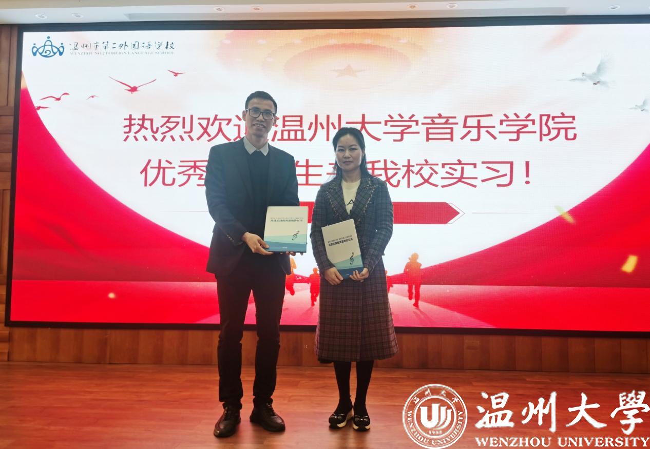 温州市第二外国语学校校长温在权、副校长朱小丰、副校长陈华云对蔡军副院长一行的到来表示热烈欢迎。教师发展Ⅱ处副主任蔡呈腾介绍了与会师生人员。朱小丰副校长强调了实习同学在校期间的管理要求,即要有一颗热爱学生的心,多听课备课,多请教老师,仪表得当等,同时,祝愿实习同学们能学有所获,让自己成为一名优秀的教师!温在权校长致欢迎词。温校长首先介绍了温州市第二外国语学校的基本概况,他寄予实习同学四点期望。希望同学们永葆一颗热爱艺术的心;实习同学需要注意“学生-教师”身份角色的转换;需要把握好成长过程中的三个要素即代表天赋的音色、 代表态度的音调、 代表专业度的音准;愿同学们把握好艺术生涯的四个阶段,即潜心求学、学以致用、学高为师、德艺双馨。
