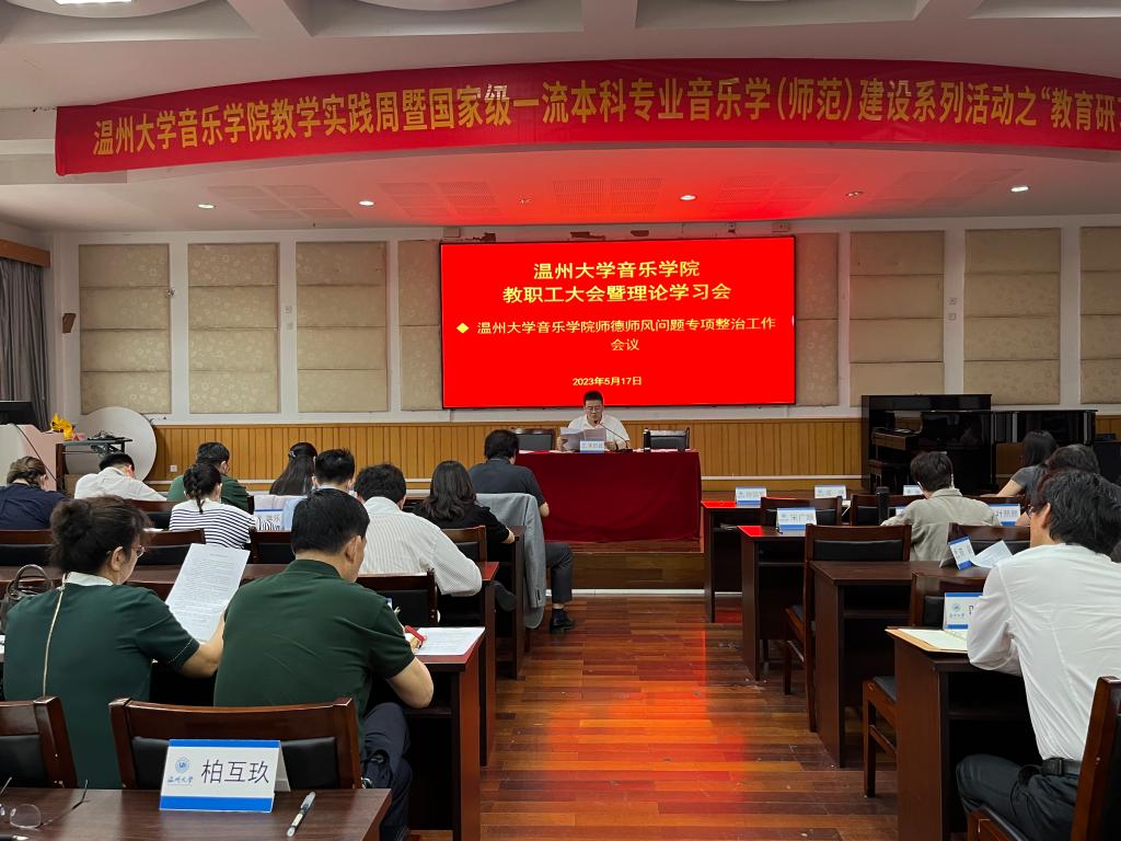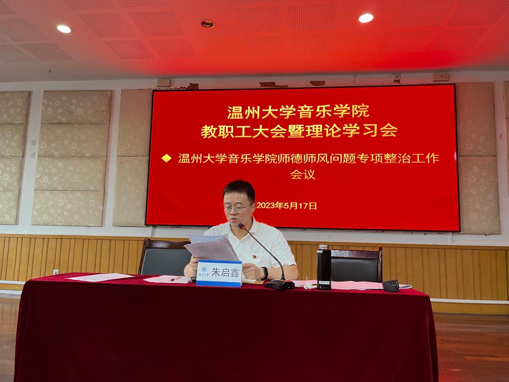 为深入贯彻落实《中共中央国务院关于全面深化新时代教师队伍建设改革的意见》、教育部等七部门《关于加强和改进新时代师德师风建设的意见》等文件精神,根据全省教育系统师德师风问题整治工作视频会议和学校师德师风专项工作部署会议精神,5月17日下午,音乐学院于音乐楼201室召开全院教工大会暨师德师风专题教育会,学院领导班子和全体教职工参加会议。