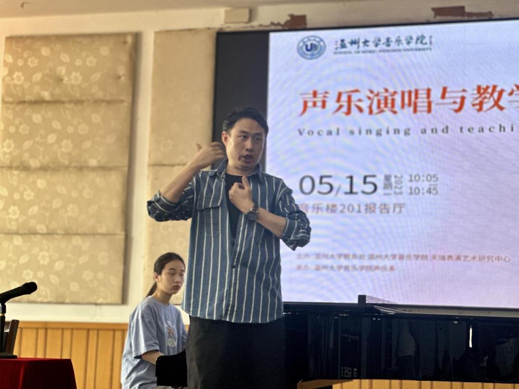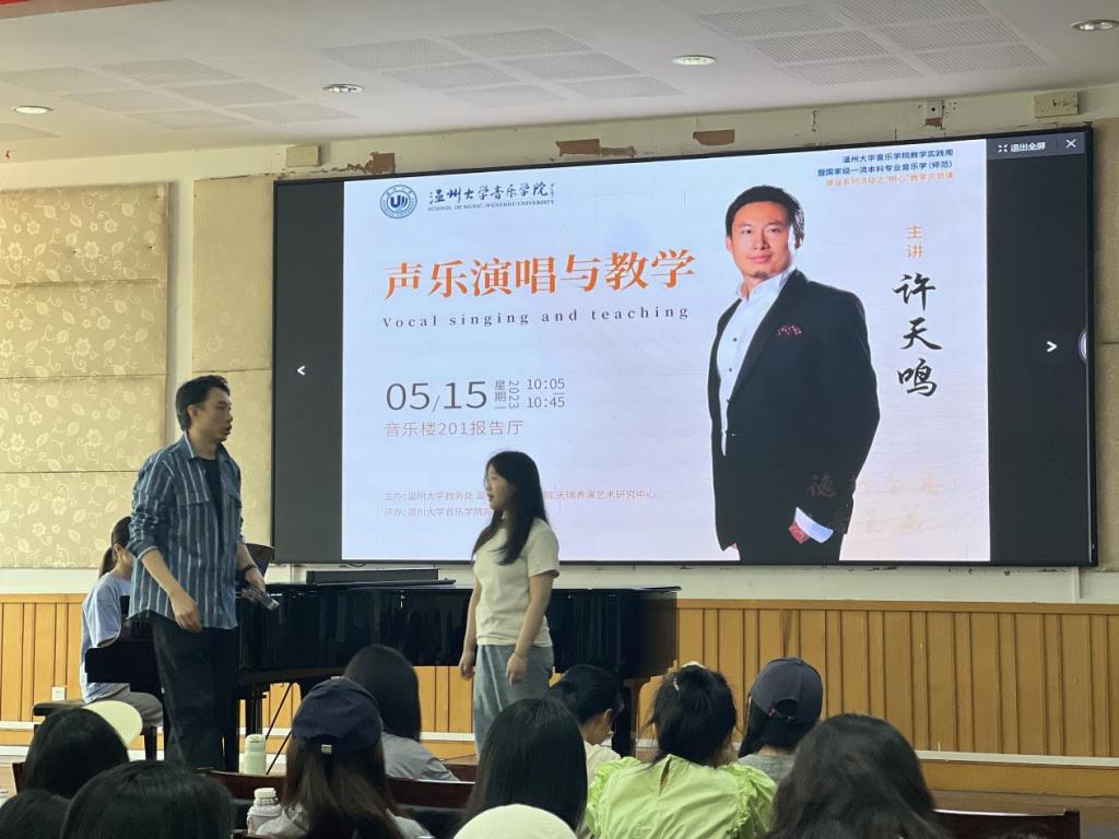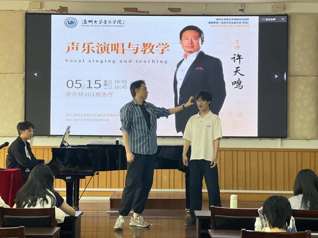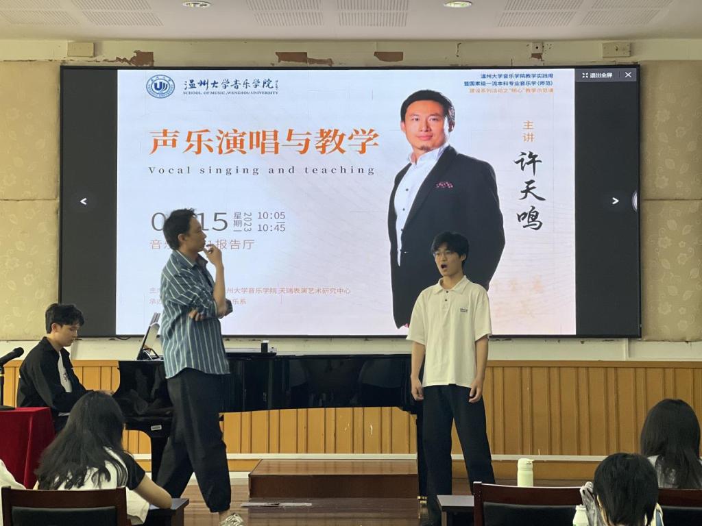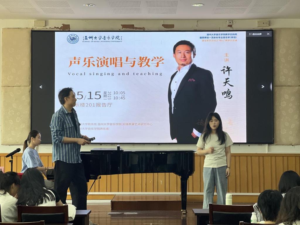 许老师在长达一个小时的授课中始终保持精神饱满,思维敏捷。针对学生歌唱过程中出现的问题逐字逐句给予悉心教导与鼓励,反复示范,结合自身经历将故事娓娓道来。经过一个多小时教学,课程结束,现场为许老师精彩的讲解以及台上学员的变化报以热烈掌声。