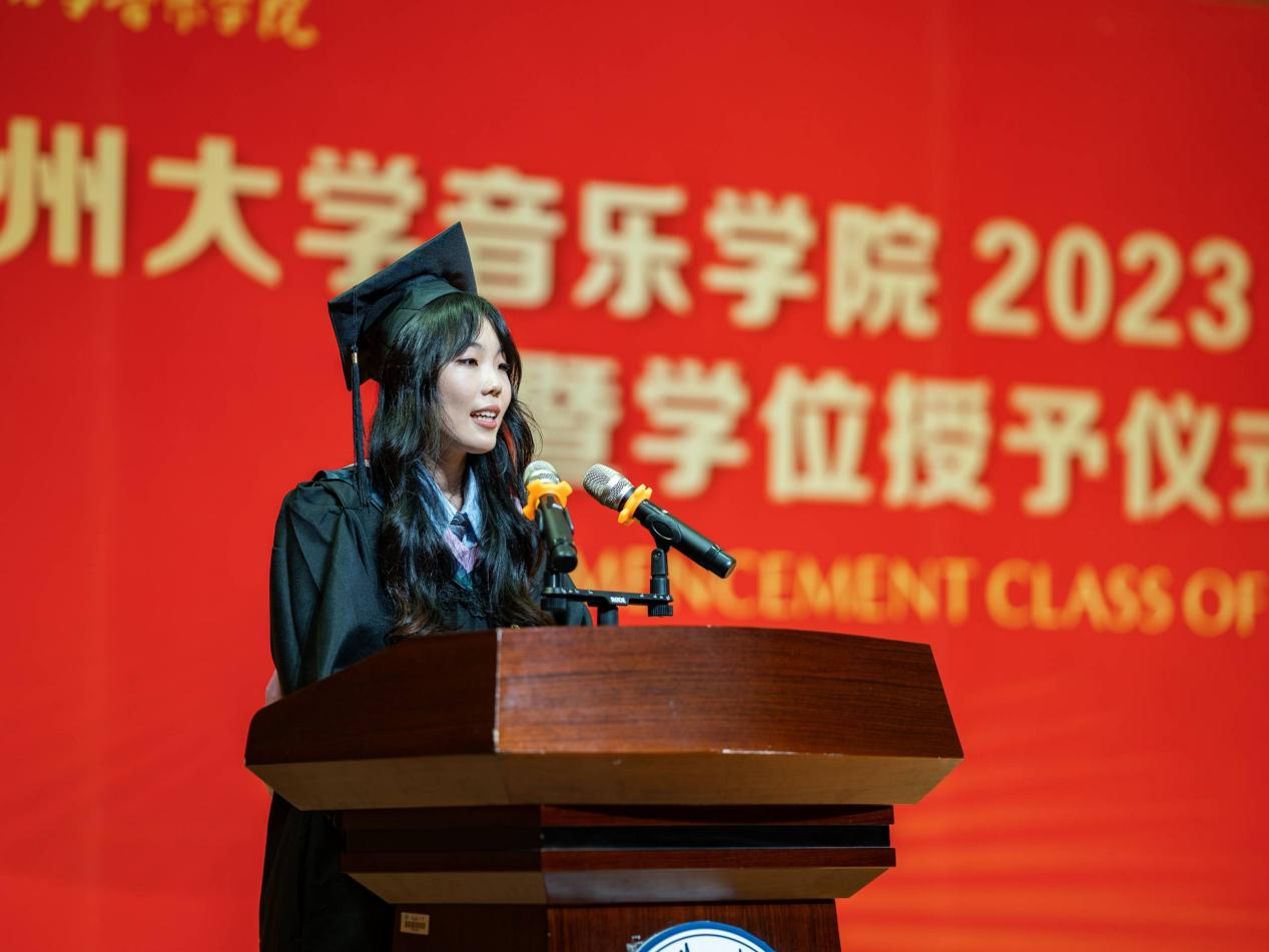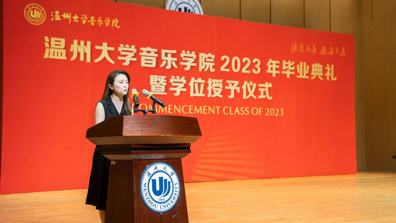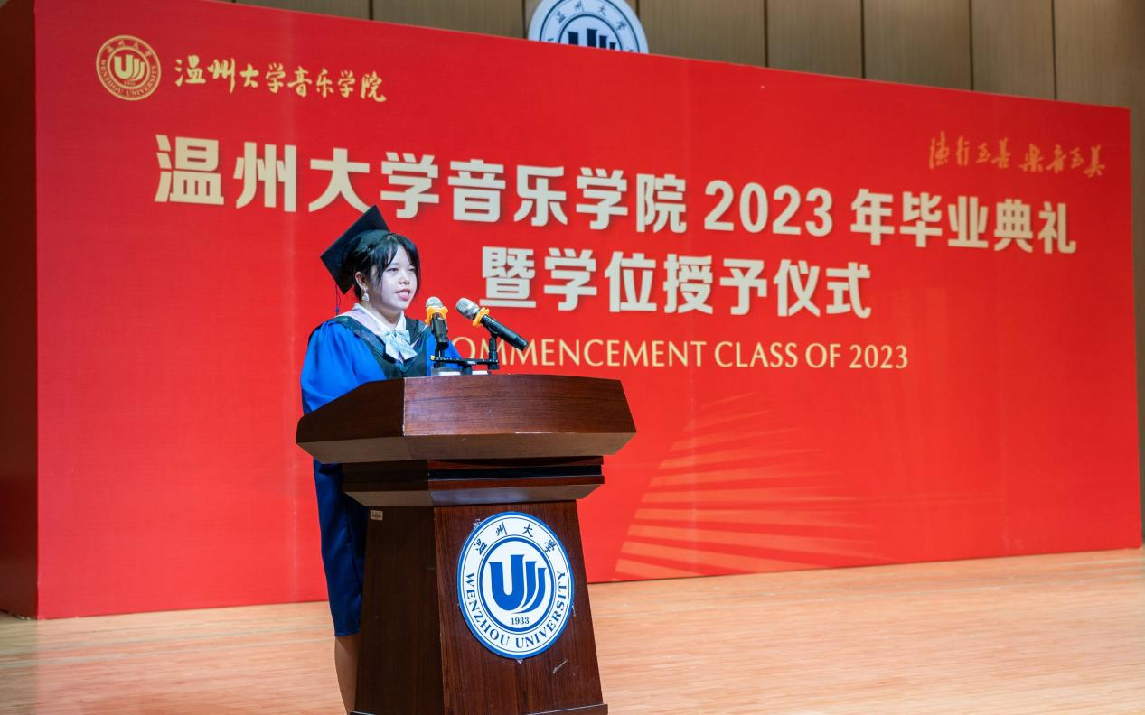 毕业生代表随后发言,研究生代表20音研钱怡漫感谢学院的领导、各位硕导和老师们的培养,她用一首歌词表达内心对母校的不舍:“你曾说毕业遥遥无期,转眼就各奔东西。”我们从四面八方而来,现在要往五湖四海而去。我们在温大这片土地上留下了欢声笑语和青春时光,告别时,能够带走的,或许是“求学问是、敢为人先”的温大精神。无论我们去往何方,永远都是温大学子。“