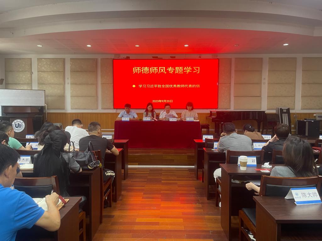 最后,开展全体教职工理论学习和师德师风专题学习。会上,朱启鑫书记领学了《学习习近平致全国优秀教师代表的信》。通过学习,在座老师们既倍感振奋,也深受教育,纷纷表示,要深入学习习近平总书记致信的重要要求,牢记为党育人、为国育才的初心使命,树立“躬耕教坛、强国有我”的志向和抱负,自信自强、踔厉奋发,为学院的发展目标不解努力。