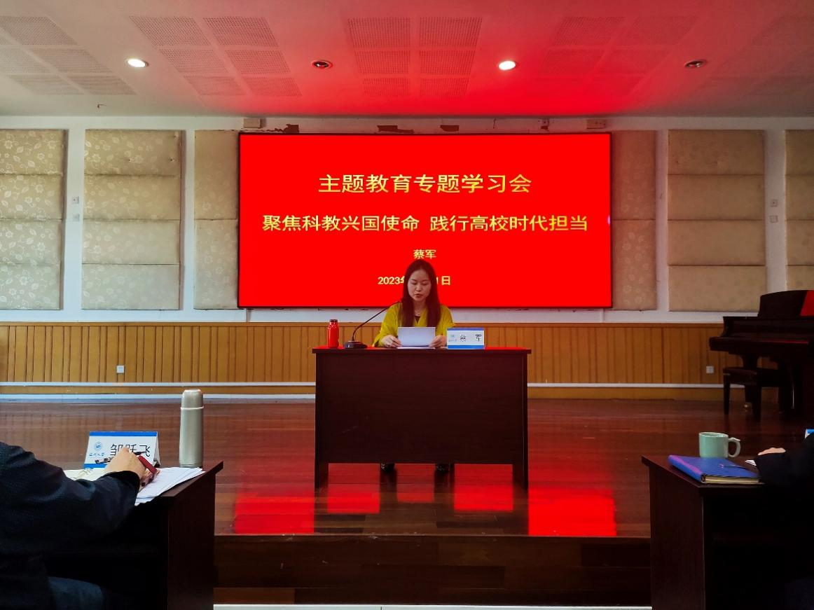 副院长蔡军以党课形式,领学《聚焦科教兴国使命 践行高校时代担当》的报告。在领学中,蔡军副院长说:教师是教育工作的中坚力量,我们要执着于教书育人,有热爱教育的定力和淡泊名利的坚守,在新时代背景之下,我们要把师德师风摆在首要的位置,本着“捧着一颗心来,不带本根草去”的精神,传承好我们的教书育人美德。同时也要有教师大局观,将自己的教书育人建立在国家建设需要中,遵循人才成长规律和科研规律,为祖国培养德智体美劳全面发展的社会主义新人。要切实提高思想认识,完善责任体系,筑高思想防线,把牢重点关口,认真抓好意识形态领域的各项工作。