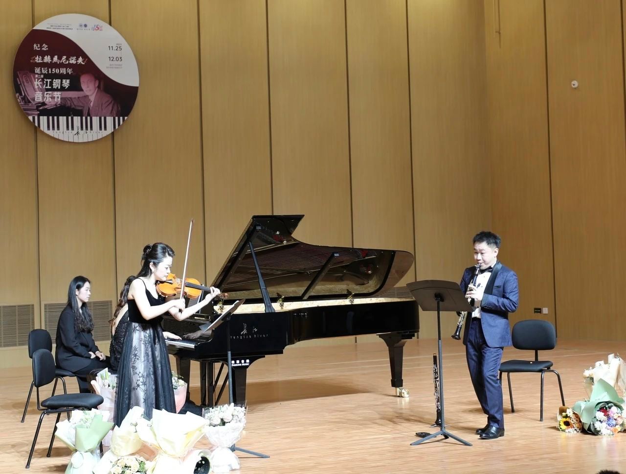 音乐会上半场第一首乐曲为g小调单簧管,小提琴和钢琴三重奏,由苏联作曲家阿拉姆·伊里奇·哈恰图良所作,他善于将民族音乐理念放到古典音乐创作中加工,且作品中常运用大量亚美尼亚的民间音乐元素,是苏联时代很有影响力的一位苏联少数民族作曲家。在该作品第三乐章我们还能听到耳熟能详的掀起你的盖头来的歌曲旋律,这也是由于1939年西部歌王王洛宾在甘肃酒泉搜集到该曲目,并以此进行创作而成。