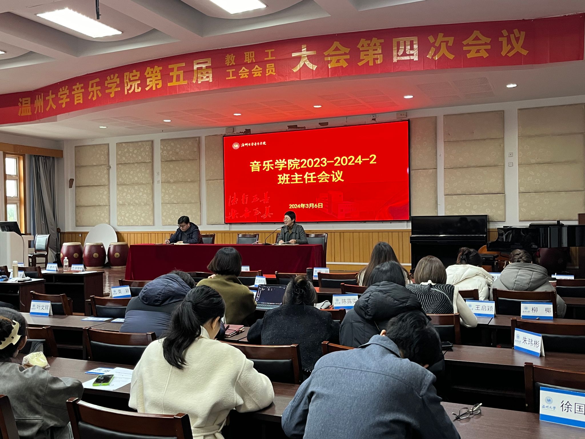 在音乐楼201学术报告厅召开2023-2024学年第二学期班主任工作会议,学院党委副书记蔡晓武,全体辅导员,全体班主任参加会议。本次会议旨在总结上个学期的工作经验,部署新学期班主任工作,交流和改进好的工作方法,提升学院班主任队伍的整体素养和工作技能。