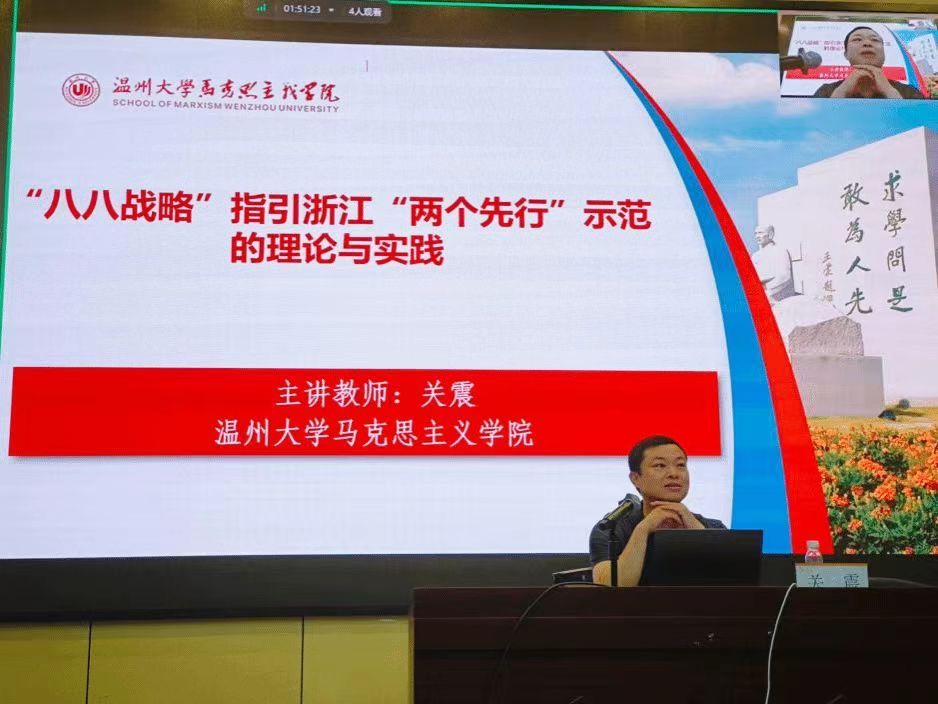 马克思主义学院关震老师从“两个先行”的产生与内涵、"八八战略”指引“两个先行"的内在逻辑、"八八战略”指引温州“两个先行”发展三方面进行授课。他将“八八战略”实施以来的各项数据指标和突出成果进行综合分析,为我们直观呈现了“八八战略”对于温州的显著影响。他认为,在当下,美好蓝图已经绘就,前进号角已经吹响。作为温大学子的我们既已生逢其时,更应牢牢把握此番大好形势,为浙江、为温州,贡献属于我们的青春力量。