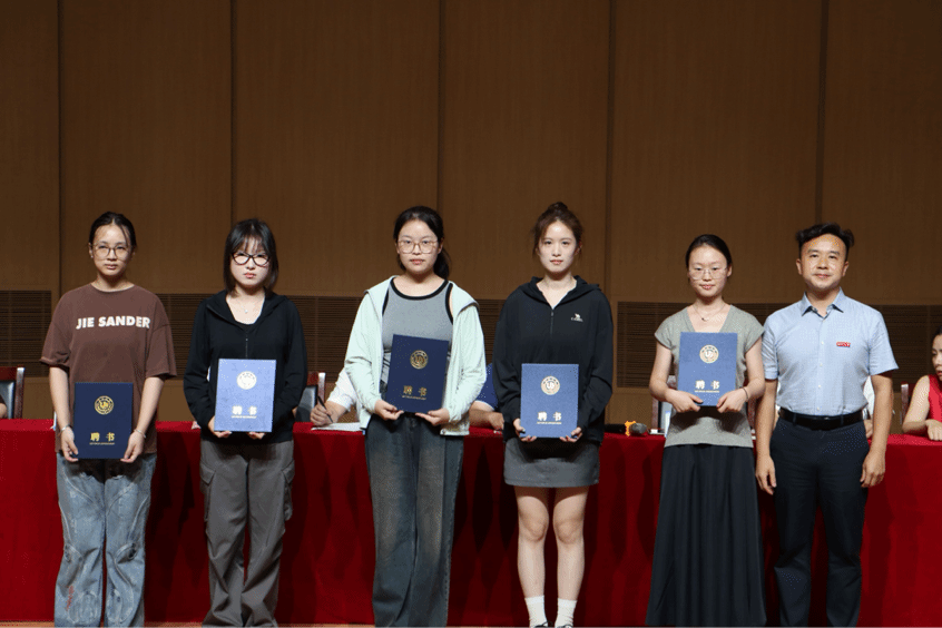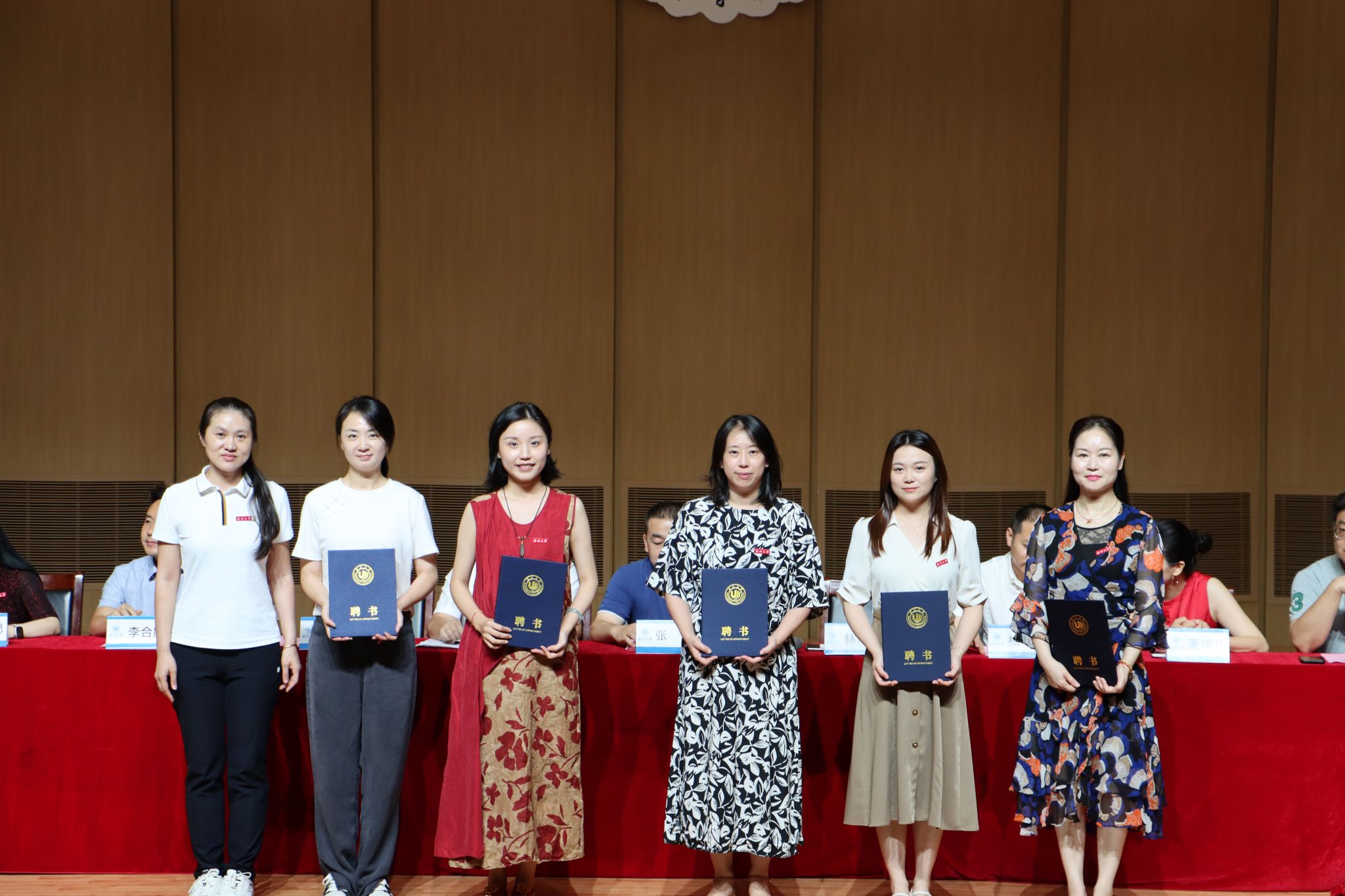 随后进行了新生班主任、班助聘任仪式,6位班主任老师,和班主任助理受聘,副院长张潇潇,党委委员李合胜分别为他们颁发聘书,并合影留念。