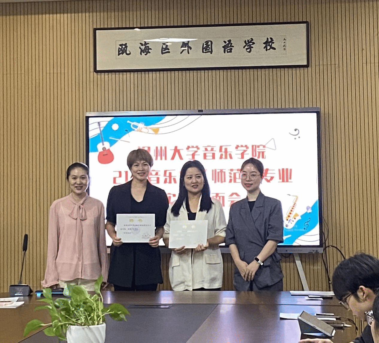 张潇潇副院长表达感谢,并颁发聘书。希望同学们倍加珍惜此次机会,严格自律,以专业素养和敬业精神,全身心投入到实习中,带着发现的眼睛和理念,学有所成,学有所获。之后,向与会温州市南浦实验中学的领导、班主任、音乐指导师调研了“色情视频