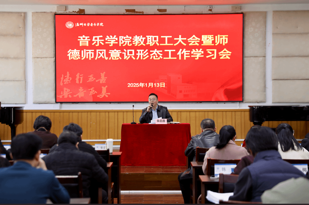 期末教职工大会暨师德师风意识形态工作学习会在音乐楼201室隆重召开。学院领导班子以及全院教职工出席会议,会议由学院党委书记朱启鑫主持。