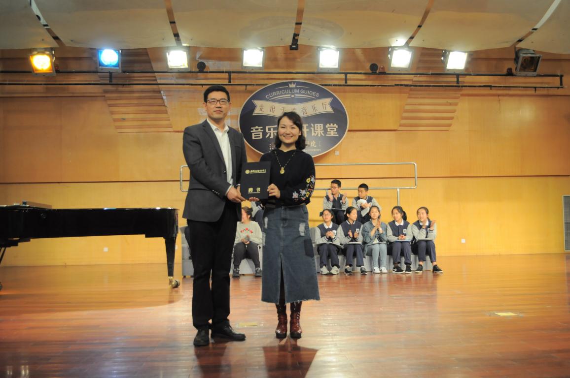 院长为陈潇潇老师颁发校外硕导聘书。接着,开始了随堂排练。首先,陈老师让合唱团的同学感受丹田的位置感受气息进行发声练习。其次,通过跳音的发声方式,进行灵敏度的训练。然后,陈老师强调了情感的表达:《再别康桥》是一首优美的抒情诗,歌曲也是优雅动听的轻音乐,节奏舒缓流畅,和谐自然,伴随着诗人情感的起伏跳跃,旋律优美柔和,轻盈委婉而略带忧伤。在演唱时要注意情感的表达。