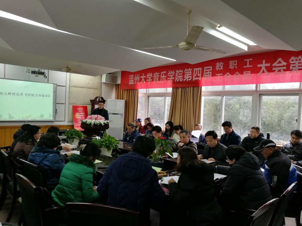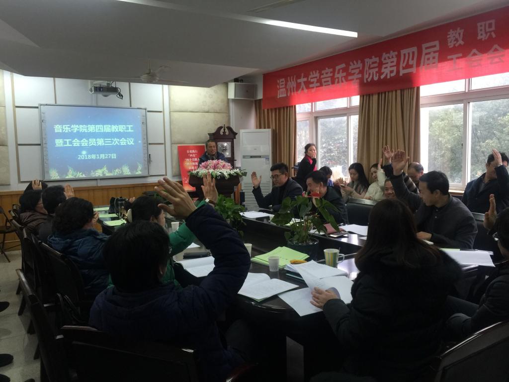 2018年1月27日下午1:30,我院第四届教职工暨工会会员大会第三次会议在音乐楼207会议室召开。会议共分为四个议程:赵玉卿同志作《学院工作报告》、刘玉亭同志作《工会工作报告》、何婷英同志作《财务公开说明》以及报告审议。会议由学院党总支书记方建敏老师主持。