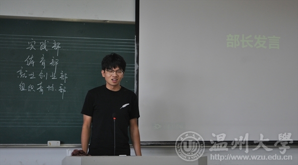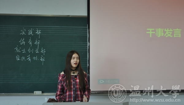 团委书记林海红老师对学生们的加入表达了热烈的欢迎,她为新生们的选择以及脱颖而出点赞,发言道:“我会的学生们要懂得在岗位上‘坚持’二字的涵义,要协调好干部事务与学习生活,以严谨的态度要求自己,以成为一个先进干事的目标激励自己,努力学习,争取奖学金。为了建设更好的大家庭一起努力!”