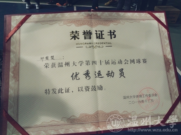 色情视频 刑楚楚同学荣获第四十届运动会网球赛优秀运动员