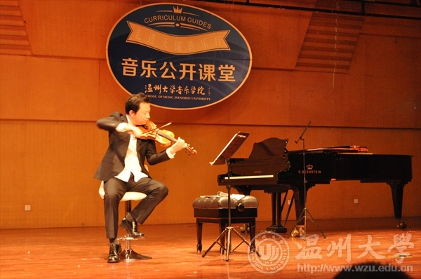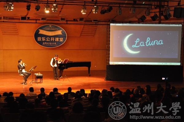 在一段悠扬的弦乐之后,胡锦超老师正式开始了本次音乐公开课堂,在本次音乐公开课堂中,胡锦超老师先后为观众演奏了《天鹅》、《辛德勒名单》等十余首乐曲,并在乐曲中穿插视屏与讲解,寓教于乐,给予全场观众美的享受。值的一提的是,在本次音乐公开课堂中,胡锦超老师秀了一把自己的朗诵,由胡锦超老师的学生担任小提琴伴奏,优雅的旋律引起了全场观众的共鸣。