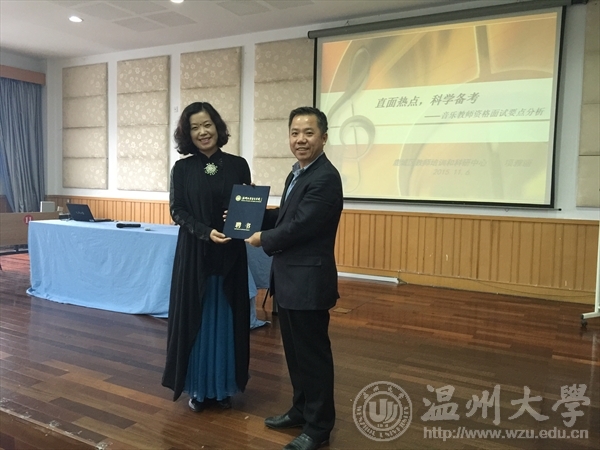 国考资格证考试辅导讲座。我们非常荣幸地请到鹿城区教师培训和训练中心的特级教师项雅丽老师,作为此次讲座的主讲人,王志毅副院长为项老师颁发了聘书, 12级毕业班的学生参加了讲座。