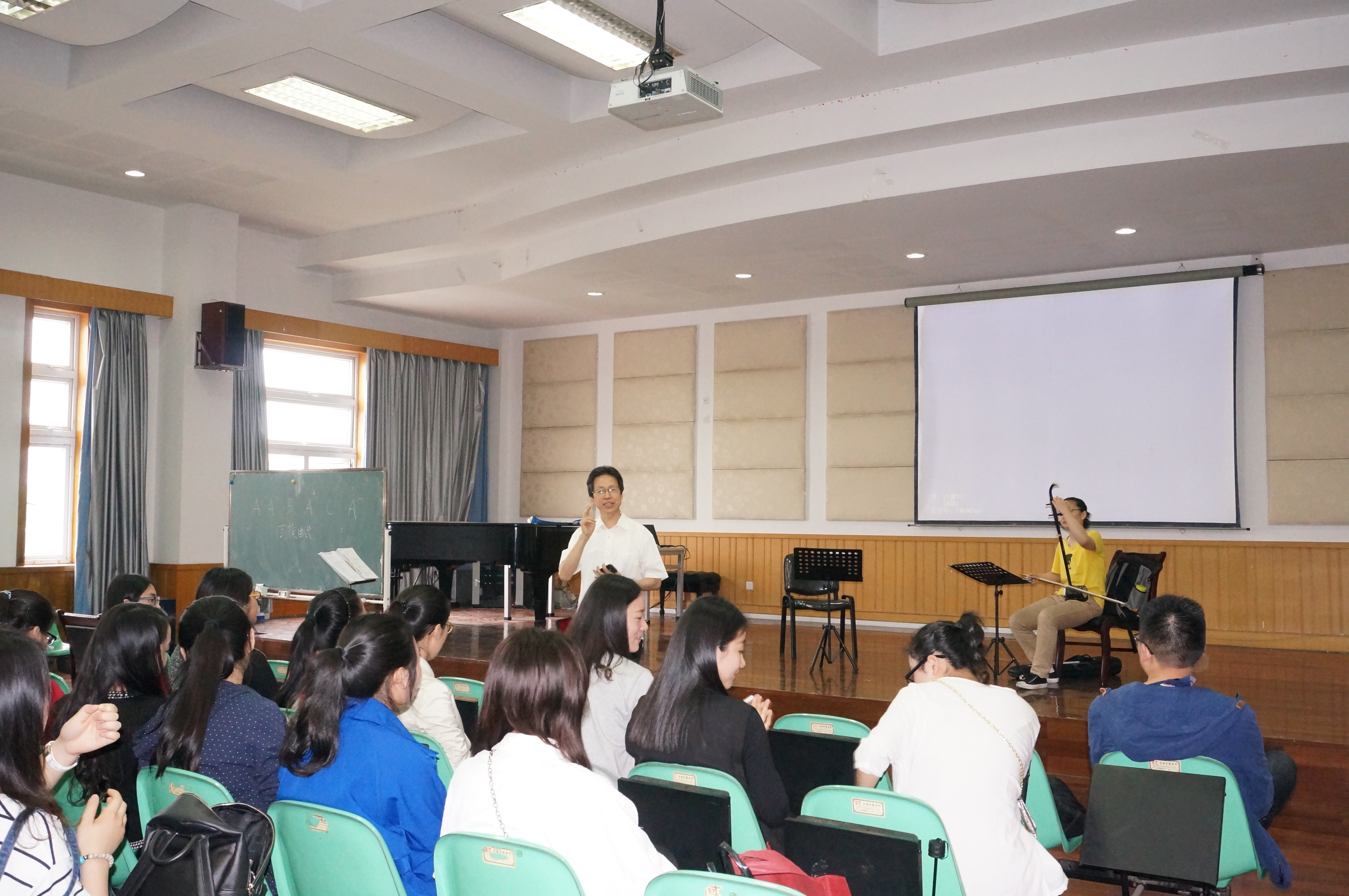 该乐曲为变奏曲式结构,旋律富有中国古典色彩,但节奏上借鉴了西方的三拍子及复拍子,新颖美妙。全曲由引子、四个段落和尾声组成。表现出主人公烦乱的心绪;后半部分音乐渐慢渐弱,音色越来越透明,情绪越来越宁静,将人们带入梦幻般的意境中,给人留下无尽的思索。乔先生的讲解新颖、细致入微,示范准确到位。其敬业精神及娴熟、优雅的演奏,赢得了教学委员会成员及到场听课的一线教师发自内心的点赞。