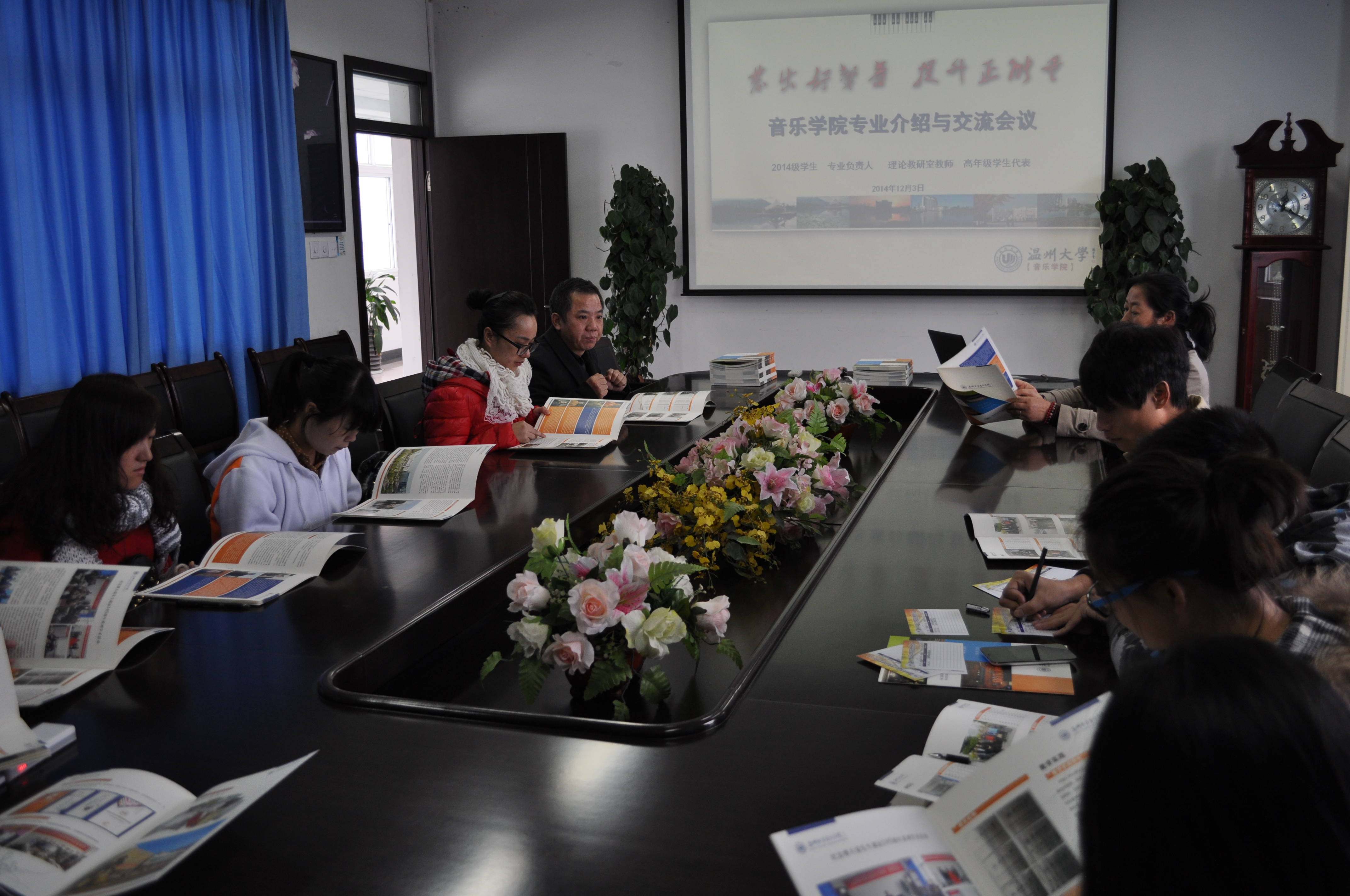 2014年12月3日下午,2014级新生专业介绍与交流会议在音乐楼309召开。参加会议的有14级新生、专业负责人李晓燕和王文韬老师。理论教研室的柏互玖、乔志亮、杨古侠、王志毅、邓深海、江松洁等六位老师及高年级学生代表刘慧群同学。会议由副院长王文韬主持。