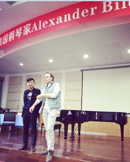 刚进学术报告厅,德国钢琴家Alexander Bildau就等在此处。首先,由张中灿老师介绍了此次讲座的主要内容,首先,1900年前后浪漫主义以后步入近现代音乐的发展,其次,人的耳朵用来培养 ,追求更新的东西 ,最终既是伟大的作曲家对摆脱调性的贡献。ALEX首先弹了一首曲子,曲子深沉,混浊,没有旋律感。这首曲子是李斯特作曲的《灰色的云》,曲子有两个特点:一是两个低音安排在同一个踏板上。 其次曲子的最后不回到主和弦上,保持张力,但没有解决。ALEX说到,不能以一个作曲家的某一个作品就定作品风格,因为一个作曲家从最初到最后,风格会大变。说到贝多芬创作风格的变化,以及国家之间风格的差异。接着,又弹了一首德彪西在1904年的作品,这首曲子中,德彪西进行了远离调性的尝试,主要有两种方式:全音阶和平行五度。 在当时并不会这么做,差不多所有的和弦都是平行五度,然而现代的流行乐中就有很多平行和声构建。接着他又弹奏了一首1909年,匈伯格的曲子,此曲在当时还没有建立十二音乐体系,这首曲子不用原来的作曲方式,曲子始终保持张力,并且有传统的引子,刚开始能找到调性,以后曲子改变音频,就找不到调性。音乐没有好坏之分,我们的耳朵具有选择权,经过自己努力了解的音乐才会更长久。