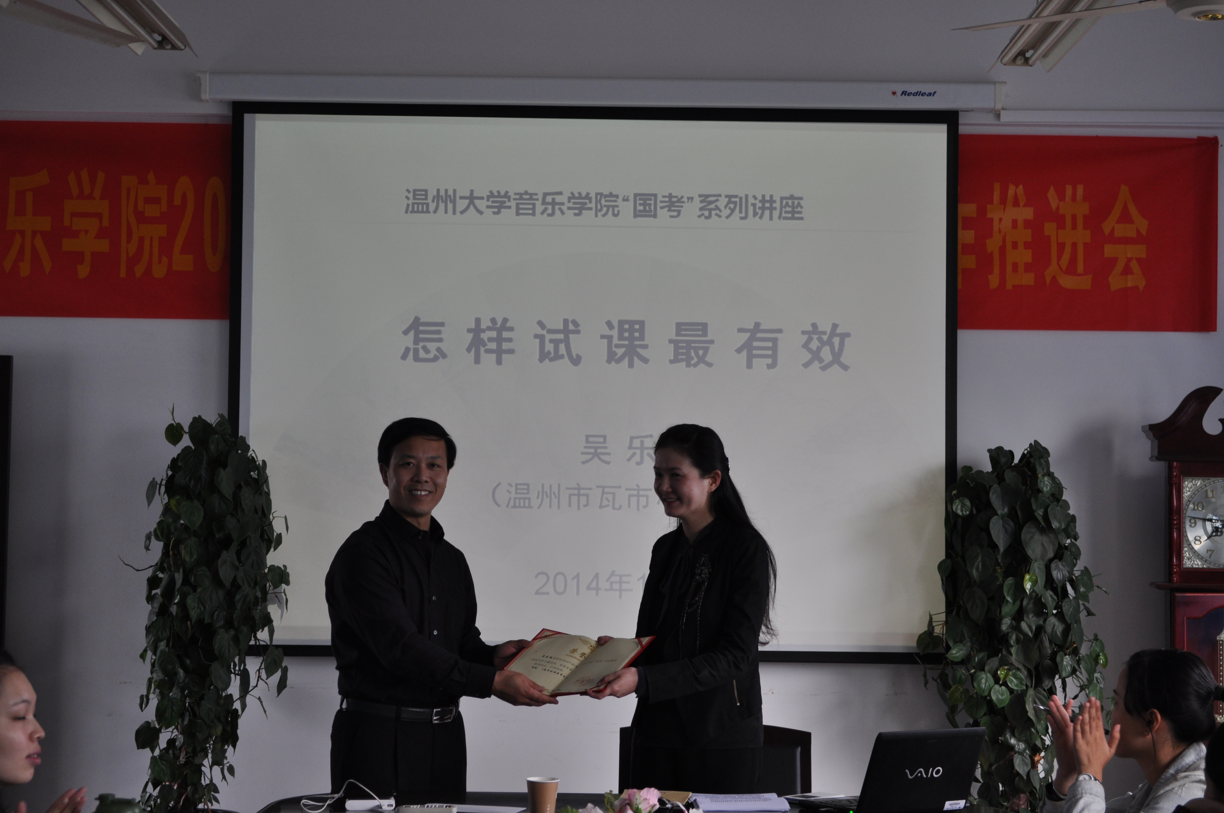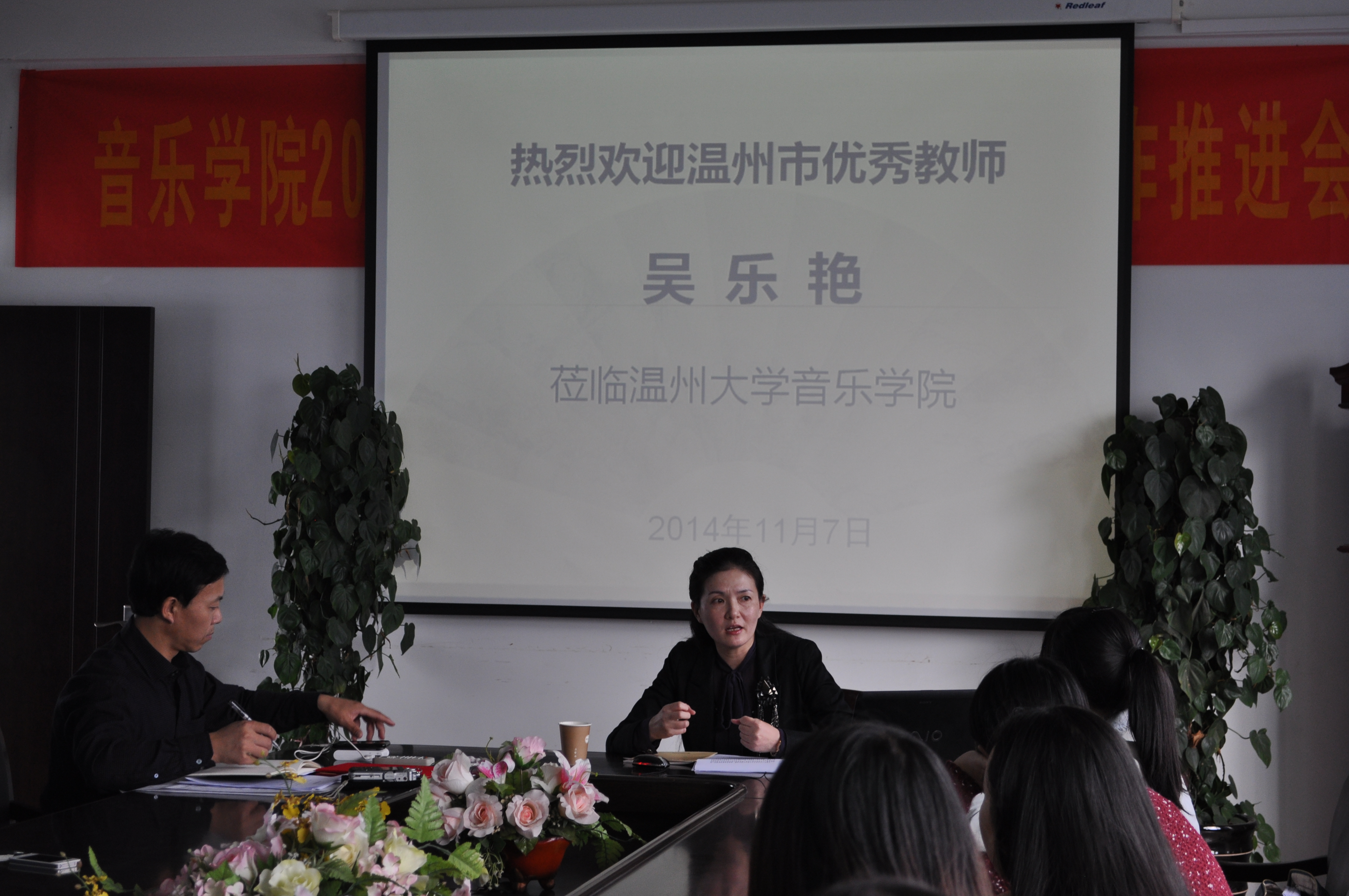 2014年11月7日下午,温州市优秀教师、教坛新秀,瓦市小学音乐教师吴乐艳莅临色情视频 ,指点学生“试课”的有效途径。色情视频 教学督导王守琢老师与色情视频 的同学们一起参与了交流。该活动由王文韬副院长主持。 吴乐艳老师就学生“国考”、“考编”之音乐教师国家资格考试过程中的试课环节,给予音乐学、音乐表演专业的学生有益指导。她建议应考的同学,一定要熟悉现行的各个版本的音乐教材,同时要打好“自弹自唱”的技术难关。