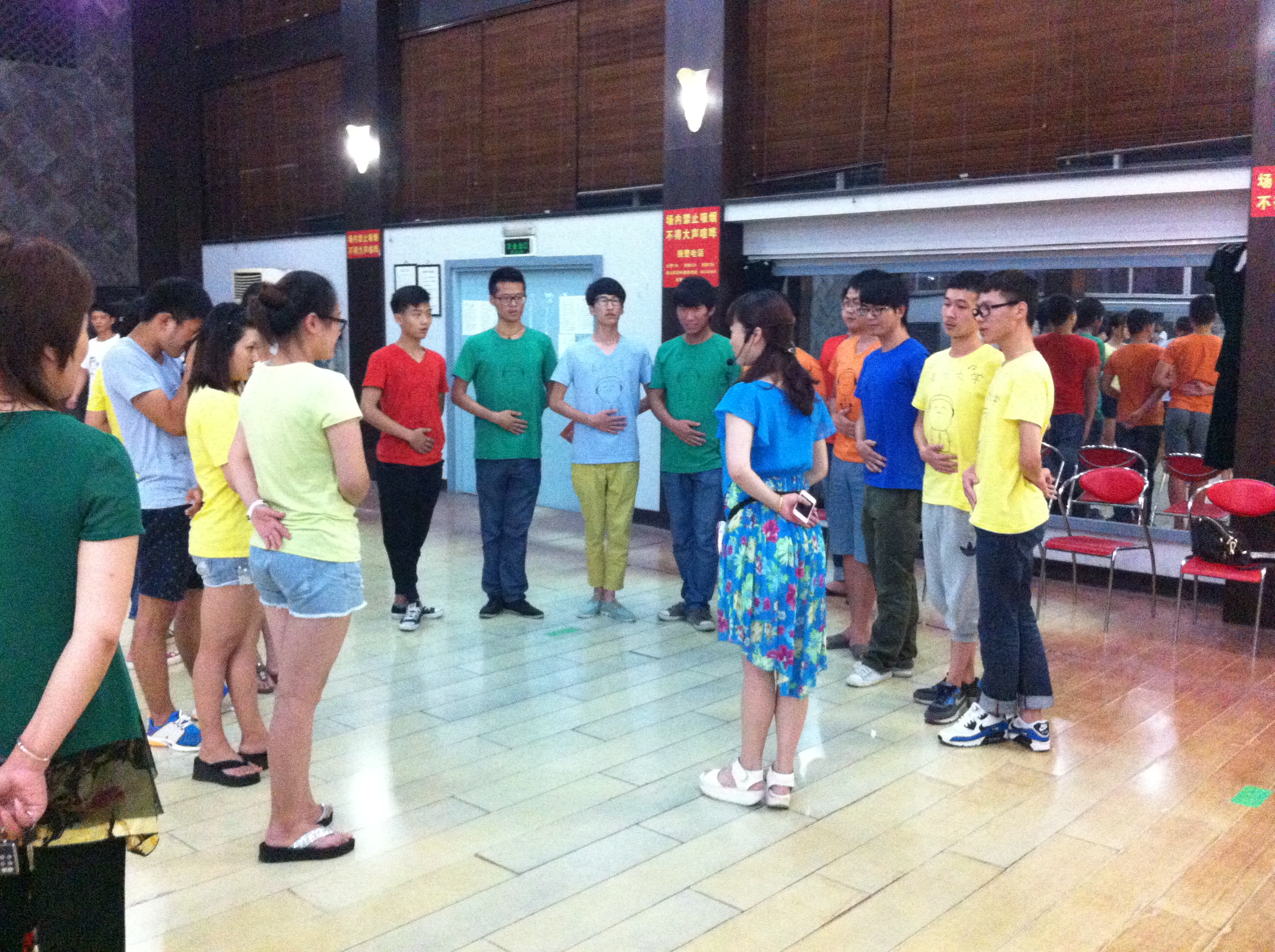 图为江南越剧团团长对实践队员进行越剧观摩教学:咬字发音、唱腔、台步等内容