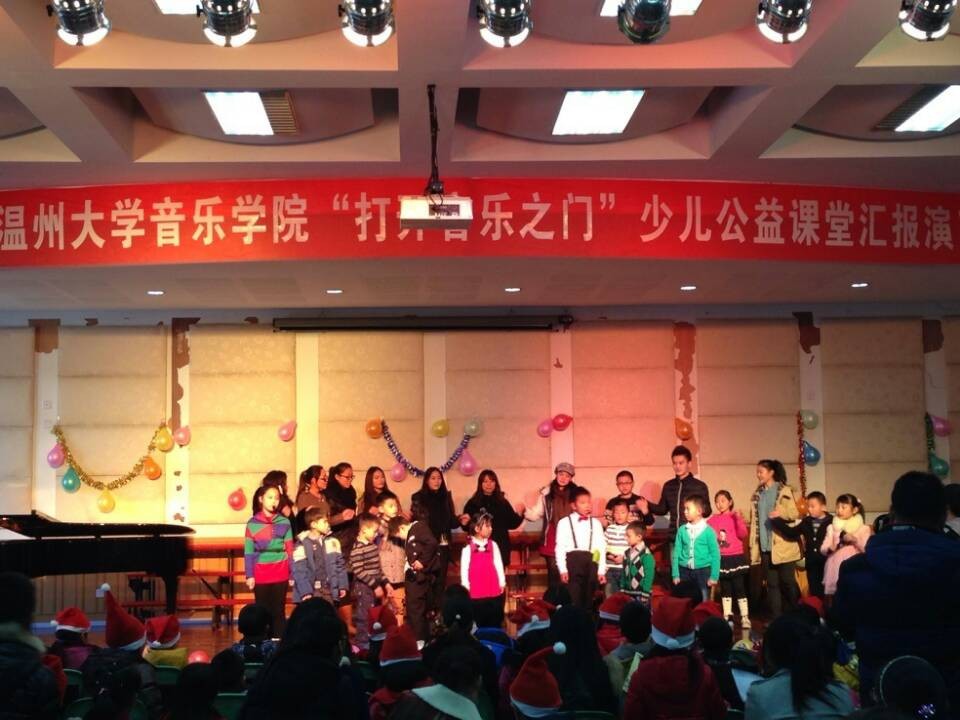 举办“打开音乐之门”公益讲堂活动的意义,以及对此次活动学生讲师和小朋友们表现的肯定,对各位教职工家长的支持表达了感谢。随后,汇报演出正式开始:两位身穿燕尾服的小朋友一起坐在钢琴前四手联弹一曲《小奏鸣曲》开场了整个演出,他们熟练的技艺征服了整个会场。合唱2班的小朋友们一起合唱了《虫儿飞》、《小雪橇》两首歌曲,带动了全场的气氛。乐理1,2班的全体小朋友也和他们的老师一起合唱了《哆来咪》、《小星星》,他们围着一起摇动他们的身体,带领大家一起走进那个美丽的世界。而合唱1班的《春晓》、《小乌鸦爱妈妈》更是令大家印象深刻,他们努力做齐动作,带着开心的笑脸,让现场的家长们都开心的鼓起掌来。最后的压轴演出是合唱2班的非洲鼓表演,节奏感十足的表演令大家都跟着一起摇摆起来,大家欢乐的笑着,唱着,仿佛置身于一个充满乐趣的音乐殿堂。