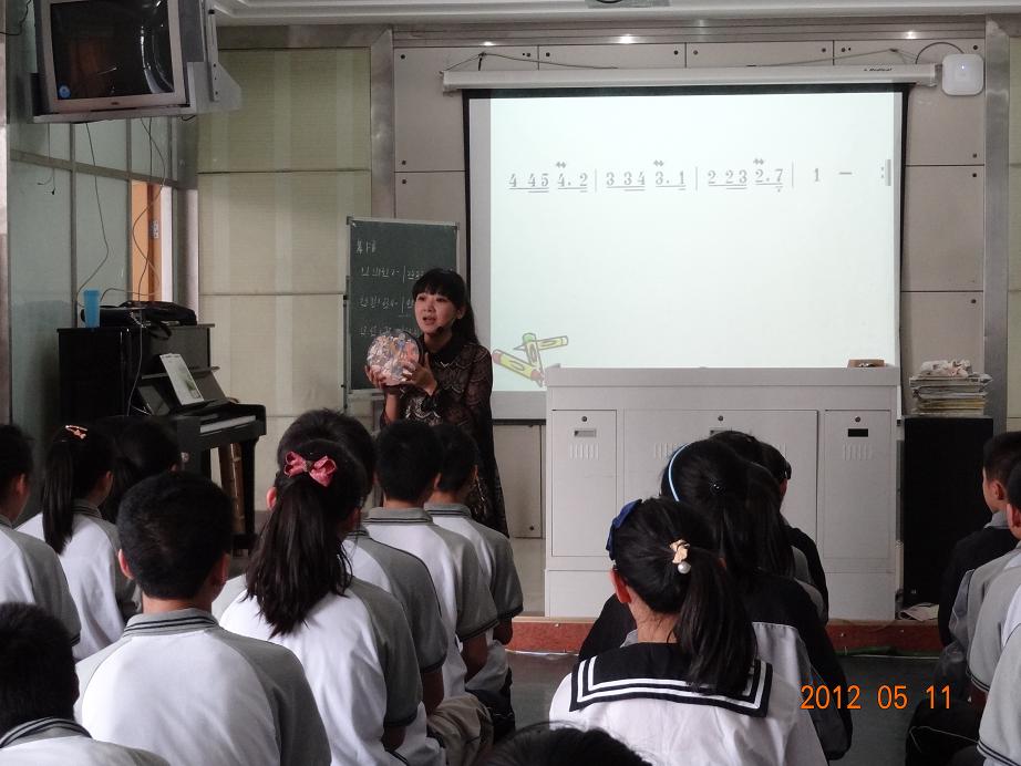 陈姬姜老师通过一堂生动的歌唱课,让同学们领悟到初中课堂教学和其他年龄阶段教学的不同:针对初中学生嗓音特殊时期的唱歌要求,陈老师充分发挥初中生的理解能力,通过启发式教学,引导学生对歌词涵义进行分析,结合旋律的速度、力度变化,教导学生如何正确运用气息带动感情演唱好一首歌。同时还注重培养学生的合唱协作意识,将歌曲改编成二声部。欢快和谐的二声部演唱和良好的师生互动,将课堂的气氛推向了高潮。