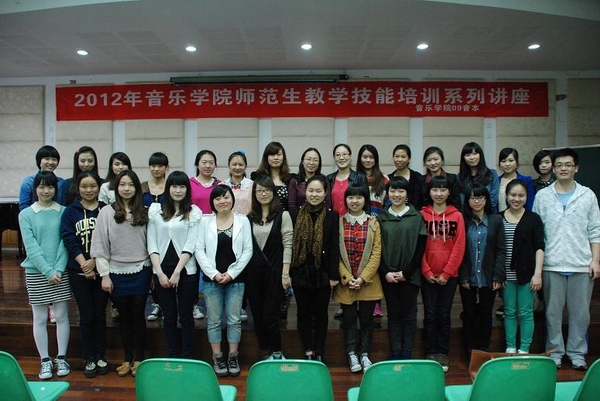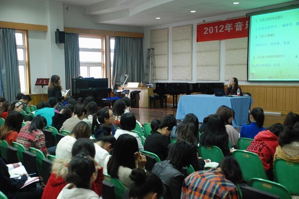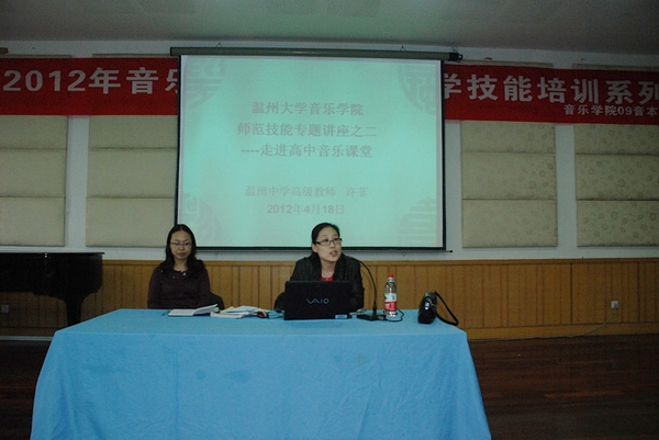 音乐师范生进行师范生教学技能培训。她在音乐楼201学术报告厅作了题为“走进高中音乐课堂”的讲座,09音本班班主任王秀敏老师主持讲座。
