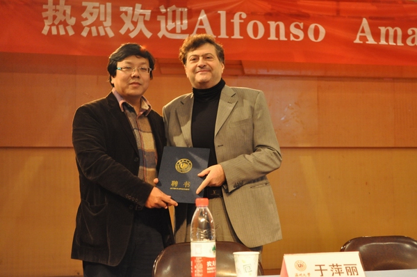 常务副院长李杰鹏副出席了仪式并为意大利Alfonso先生颁发了兼职教授的聘书。声乐、钢琴教研室教师,09级、10级、11级学生聆听了讲座。