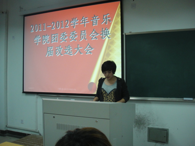 本次换届改选大会于2011年11月4日晚18:30在外语楼406室进行。院学生科副科长、团委书记叶如芳老师,辅导员向伟老师,团委副书记蓝柳燕同志出席了本次大会,学生会主席潘椿年同志,副主席吕柳慧同志列席会议。原团委副书记蓝柳燕同志组织带领与会团员学习团委的工作职责并代表上一届团委作了工作总结报告,全面、客观地回顾了上一学年共青团工作开展情况,明确了今后一个学年团委工作的总体要求和主要任务。