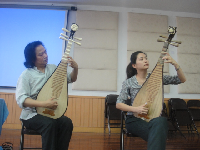 之后进行了提问环节,同学们踊跃发言,方锦龙先生非常亲切地回答了这些问题,并且与董凌凡老师合奏了一曲,博得满堂喝彩。方先生还展示了他研究的五弦琵琶,带给我们各种不同的音乐风格,正应了他的那句“琵琶是乐器之王”。最后,方锦龙先生演奏了《梅花三弄》与《十面埋伏》,十分精彩,并且与他的儿子合奏了一曲爵士民族乐,很有特色。