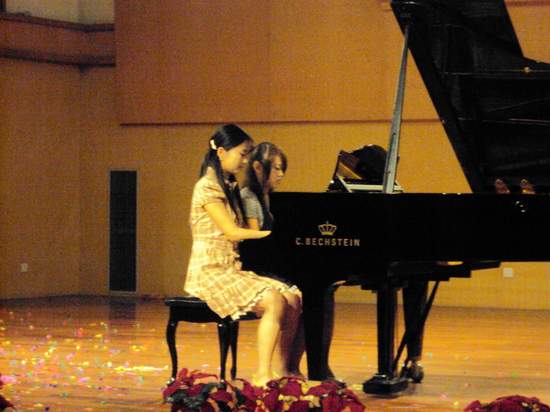 此次汇报演出是四手联弹专场。表演者都是08级和09级音乐学专业和音乐表演专业的同学,曲目有《春节序曲》、《天鹅之舞》、《土耳其进行曲》、《维也纳进行曲》、《樱花》、《拉格泰姆》、《牧童之歌》、《拉德斯基进行曲》、《蓝色多瑙河》、《太阳出来喜洋洋》等十多首经典曲子。整场演出效果不错。