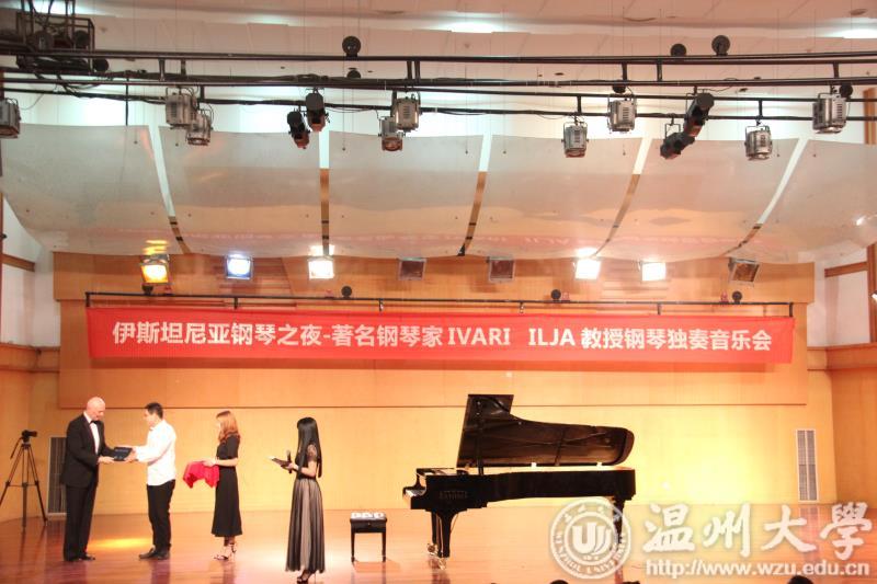 院长赵玉卿教授亲自为IVARI lLJA教授颁发荣誉证书。随后,音乐会正式拉开帷幕。上半场,IVARI ILJA教授演奏了 路德维希•凡•贝多芬的 《P'ano Sonata No.2 in C sharp minor Op 27(Moonlight Sonata)》 纵观全曲,由慢变快,感情表达逐步加强,整个乐曲有较强的整体性,与"月光"相衬,让人沉思,打动人心,使现场每一位听众的音乐细胞都活跃了起来。而下半场,听众们的热情依然不减,IVARI ILJA教授又为我们带来了弗里德里克•肖邦的奏鸣曲《Frederic Chopin Piano Sonata No.3 in B minor Op 58》,这是四首谐谑曲中最为著名,被世人经常演奏的名曲之一 ,这首作品明朗热情,具有一定的幻想性与戏剧性,并没有悲剧性的突出。在同一作品中音乐表现出了不同的情绪,对其后音乐创作中打破旧的曲式结构,发展新的特点,产生了深远的影响。在此期间, IVARI ILJA教授不仅演绎了贝多芬和肖邦两位大师的作品。而且,还带来了爱德华•图宾的《Eduard Tubin Ballade on a Theme of Mart Saar 》 以及Tonu Korvits的《To The North 》,两位大师的作品在IVARI ILJA教授精彩地演绎下大放异彩。虽然节目单曲目已演奏完毕,但观众高涨的情绪仍未消减,现场掌声不断。而IVARI ILJA教授又怎么会让大家失望呢?多次返场,用既严谨又幽默并且富有激情的方式以及近乎完美的演绎为现场的听众们带来了一场难忘的听觉以及视觉上的盛宴,让热爱音乐的朋友们在由音符编织的梦幻世界中环游了一番。