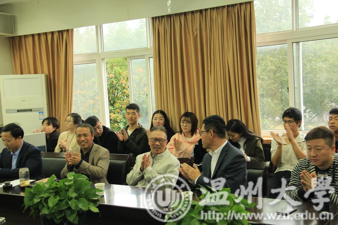 的全体老师、研究生以及本科生合影留念。正如姜嘉镳先生所说:“我又重新感受到了其乐融融的气氛。”随后,由姜嘉镳先生发言,主要向我们讲述了具有生命的歌曲都来自民间,并建议我们能够把“采风”作为一个教学环节写进教学计划。接下来,姜嘉镳先生为我们介绍了温州民歌的种类,例如:乐清山歌、永嘉山歌、瑞安童瑶以及瑞安对歌。这些民歌素材都值得我们去采撷。此外,姜嘉镳先生还向我们介绍了温州方言,并认为温州方言是我们温州的活化石,与普通话不同的是:它不仅有八个声调,还保留了古代最原始的汉字发音。