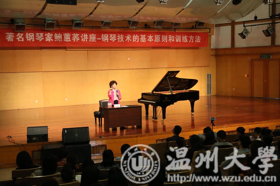 首先由赵玉卿院长为鲍蕙荞老师颁发了客座教授聘书。鲍蕙荞老师表达了对温大师生的感谢,随后便开始了主讲。首先鲍老师提出学习钢琴是一个漫长的过程,提出要脑子思考,意识与听觉相结合的观点,着重讲解了对神经的训练,强调意识在前,要让听觉引领练习,演奏。鲍蕙荞老师结合自己的亲身经历与经验,告知师生们所有的演奏,首先要了解乐器的基本原理,再由浅入深。紧接着鲍蕙荞老师提出技术与发音的原理密切相关的基本原则,分别从下键的高低,力度,速度,角度,横向移动,旋转式移动和手指移动的部位等方面进行阐述。鲍老师着重对于入门时需注意的各方面进行了详细的讲解,从身体协调性,坐姿,自然与放松等方面展开阐述,并提到了我们要利用当前庞大信息量的优势,针对当前浮躁的问题,强调了要由浅入深,循序渐进的重要性,并提出作为一名钢琴老师不要急于造星的观点。随后对“练习曲要不要每一条都弹”的问题进行剖析,鲍蕙荞老师的回答是基本上都要弹,并且要科学的弹。鲍老师将学习过程比喻成建造房子的过程,只有把各个技术环节搞明白,先慢后快,打好地基,最后才能建造出美丽的房子,最后鲍蕙乔老师提出高抬指训练是一种方法,手段。分别从慢练,启动快,下键速度即触键速度快,还原快即放松快等方面进行了详细的阐述。最后,讲座在鲍蕙荞老师的寄语中完美落下帷幕:希望各位师生在掌握基本原则后,结合自身情况,钢琴水平得到提高。