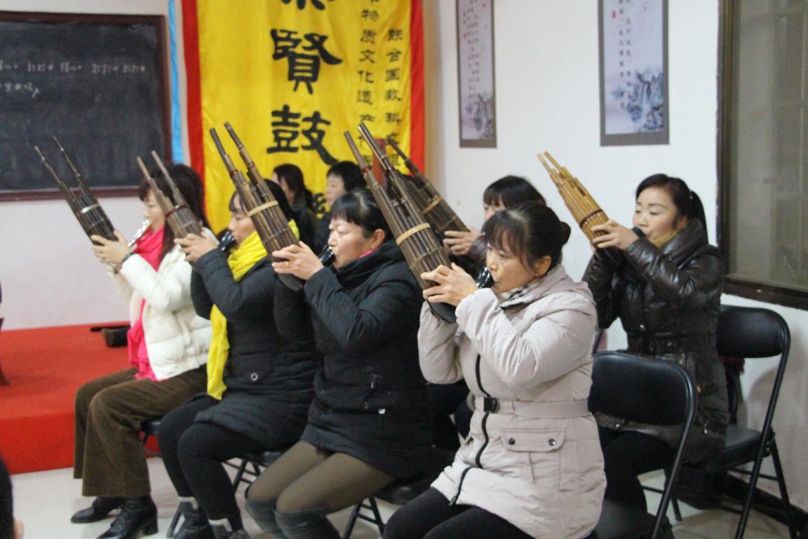 在演奏开始之前由国家级传承人田中禾老先生为我们讲解集贤西村鼓乐社的历史,田老先生讲:“集贤鼓乐属于唐代宫廷音乐,据师傅张有明口传,集贤这个地方的历史相当悠久。早在秦代的时候,渭水南边,现在终南往东这里建有朝阳宫,到了西汉武帝的时候就在集贤的东北角建有皇家戏楼,大唐初期唐高祖李渊下旨给尉迟敬德建造‘圣寿宫’,武德六年,以集贤南北走向一条小河为界,把集贤化为东瀛和西社,东瀛是皇帝的行宫,西社为百姓聚居地。因终南山一带风景秀丽,皇族常来此游玩、狩猎。唐玄宗时号召与民同乐,西社很多青年人进入圣寿宫学习音乐。‘皇家梨园’队伍不断扩大,两大乐师李姓和王姓立足圣寿宫,把宫廷音乐传授给弟子,此时乐曲达到两千多首是最鼎盛的时期,到第45代传人张有明是仅仅只剩124首乐曲。对我们后人来讲,是传承文化的重任,我们乐社从我开始自99年培养了五六批社员,我认为鼓乐最重要的是鼓和韵曲,缺一不可。