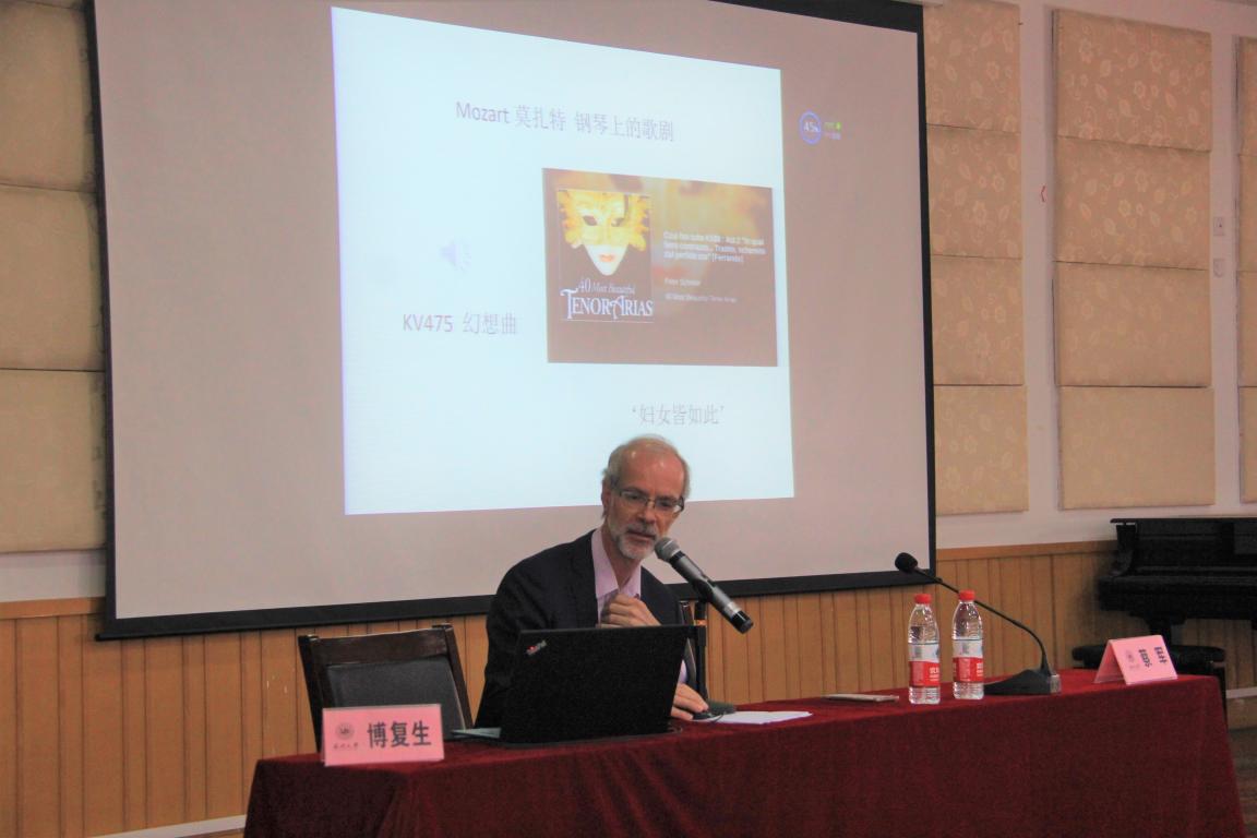 早上十点钟,教室内已经是座无虚席。或许是因为昨天晚上的狂欢,今天的场内气氛有些许低沉,但是演讲开始后博复生教授用汉语说的第一句“大家好”,让全场的气氛放松许多。讲座正式开始,博复生教授详细的为大家解读了听录音的重要性与危险性,其专业简洁的讲解通俗易懂,诙谐幽默的风格和流利的中文也让学生们倍感亲切。然后博复生教授给学生们听了各个时期选取的代表钢琴家的录音,详细讲解了如何听这些录音,引导学生找到一个正确方法来听录音以理解录音背后更加深刻的含义。讲座结尾,博复生教授进行了简单的总结。
