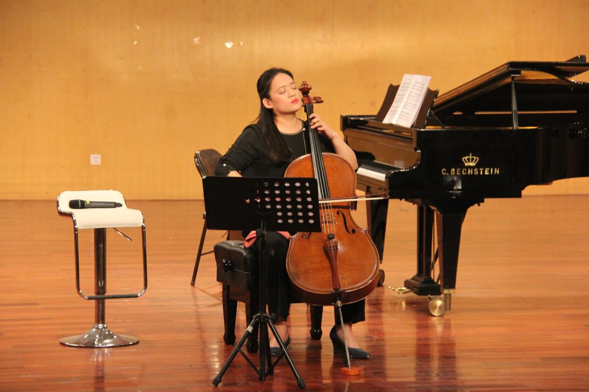 当日晚七点整,由赵光雯博士主讲的“大提琴发展史--从巴洛克到二十世纪”如期开展。为同学们讲述大提琴的发展过程,大提琴,为西洋乐器,是管弦乐队中必不可少的次中音或低音弦乐器,属提琴族乐器里的下中音乐器。大提琴音色浑厚丰满,具有开朗的性格,擅长演奏抒情的旋律,表达深沉而复杂的感情,也与低音提琴共同担负和声的低音声部,有"音乐贵妇"之称。大提琴最初在意大利语中被拼作Violoncello,后来逐渐简写为Cello。 大提琴以其热烈而丰富的音色著称,是交响乐队中最常见的乐器之一。适合扮演各种角色: 有时加入低音阵营,在低声部发出沉重的叹息;有时则以中间两根弦起到节奏中坚的作用。大提琴是中低音乐器的代表,它沉重、委婉、伤感……当时光在大提琴的弦上流逝,大师们则以各种方式捕捉刹那、感受永恒。大提琴最为辉煌的时刻,要数作曲家赋予其表现如歌的旋律的使命。整个大提琴组奏出的美妙的旋律,足以令交响乐队中的任何其他乐器都相形见绌。赵博士先是为同学们演奏了一段乐曲,再给同学们讲解了大提琴如何拉出不同的声音。接着又演奏了《无言歌》,她在演奏的时候完全沉浸在乐曲之中,同学们听得也在安静的听着,会唱的气氛非常宁静且舒适。至此,第三场音乐会也圆满结束。