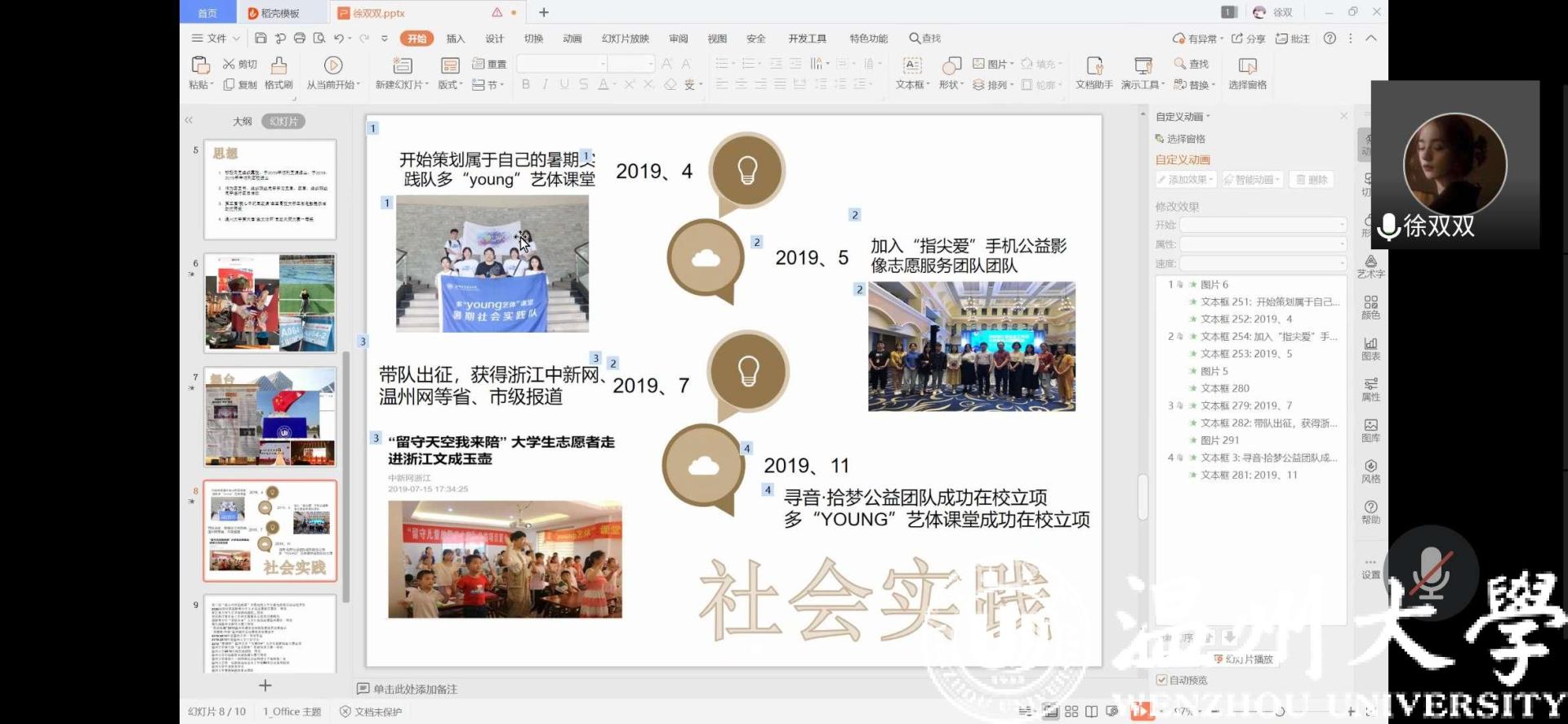 活动伊始,主持人就本次评选做了简单说明。随后,16级蒋雅馨,17级彭敏以及18级徐双双同学依次进行PPT展示。他们从个人经历出发,展现出自我勇于面对困难、敢于承担责任、努力成材的良好风貌。在三位同学展示结束后,辅导员曹老师做了总结。