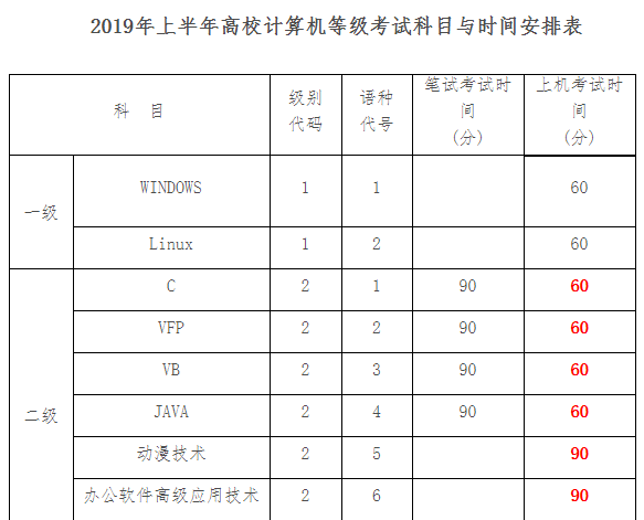 (二)上机考试一级、二级:2019年4月20日至21日。(具体时间安排另行通知)。