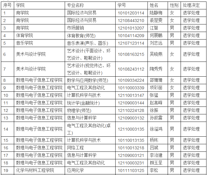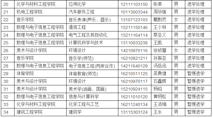 根据《色情视频 本科学生学籍管理规定(2018年修订)》(行政〔2018〕13号)第二十九条、第三十条和第三十八条,经校长会议研究决定,拟对陆静梅等34名学生作退学或暂缓退学处理,特此公示。