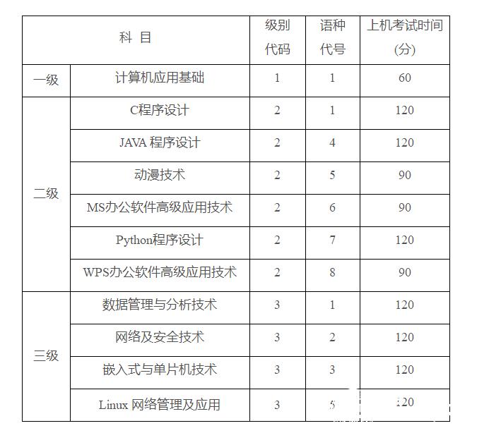 2022年下半年高校计算机等级考试科目与时间安排表