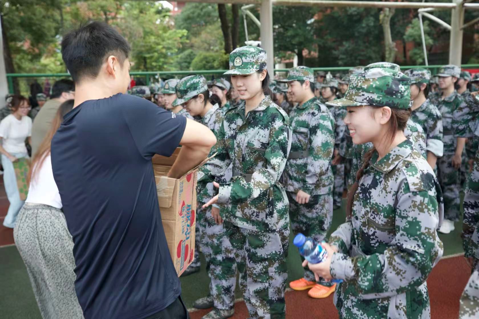 随后,领导老师们将饱含着学院深切关爱的军训慰问品一一送到同学们手中,学院领导、新生班班主任和辅导员们与同学们进行了细致交流,了解他们的适应情况,班助们亦积极发挥作用,活跃在现场提供服务。